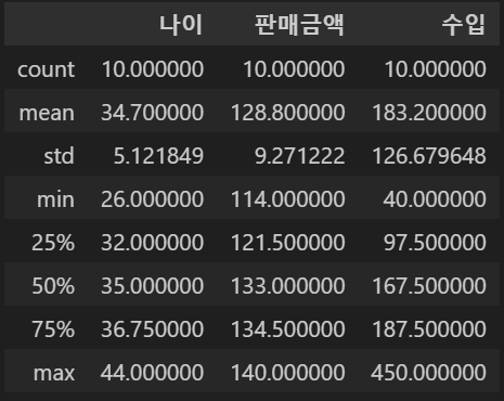 describe() 메서드를 사용하면 데이터의 통계 요약본을 보여줍니다.