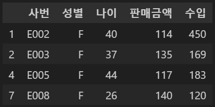 - df[df['수입'] > 100]: "수입" 열 값이 "100"보다 큰 행을 선택합니다.