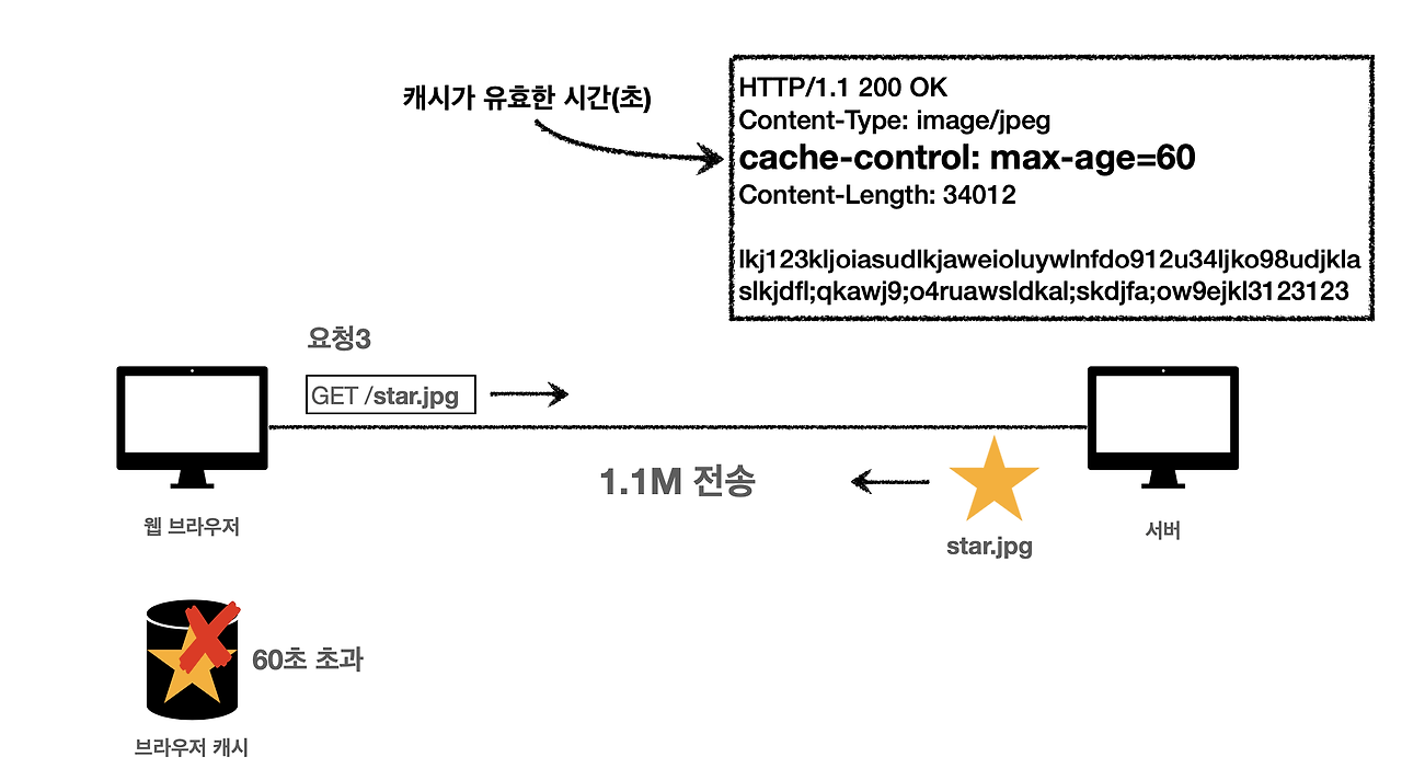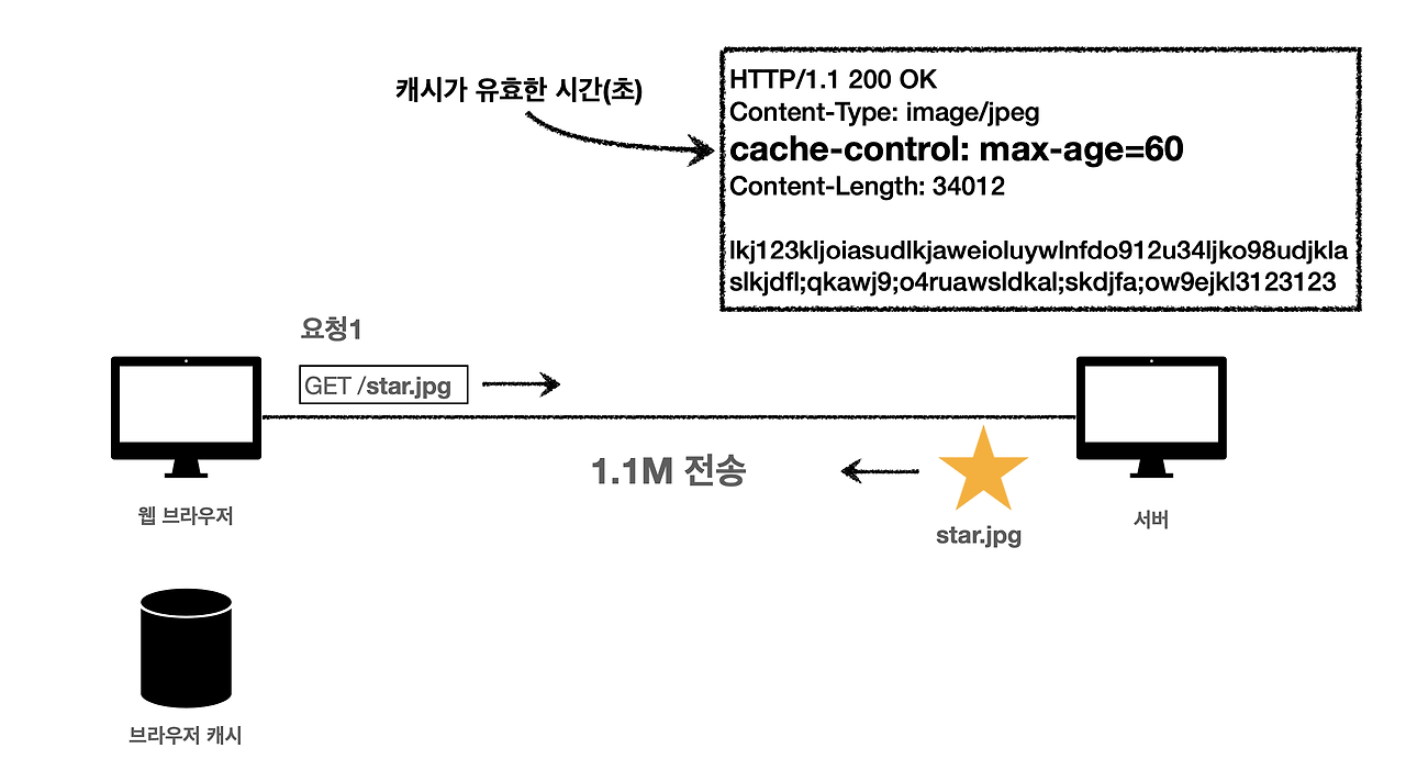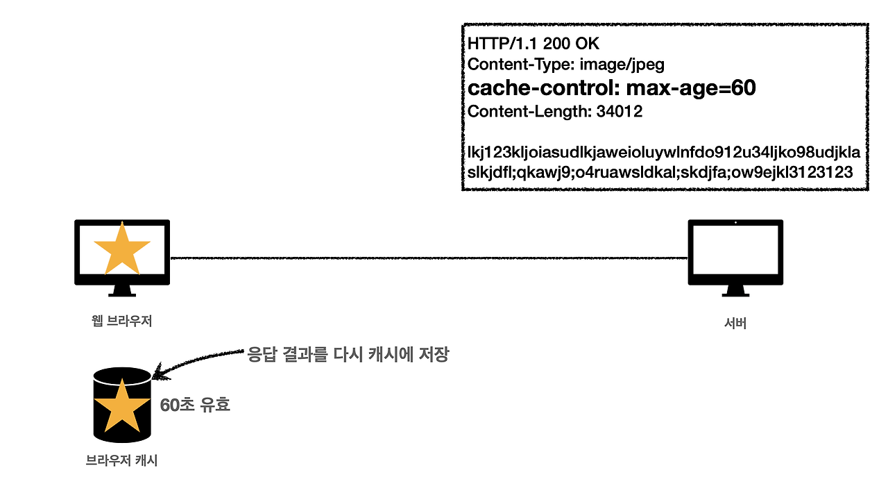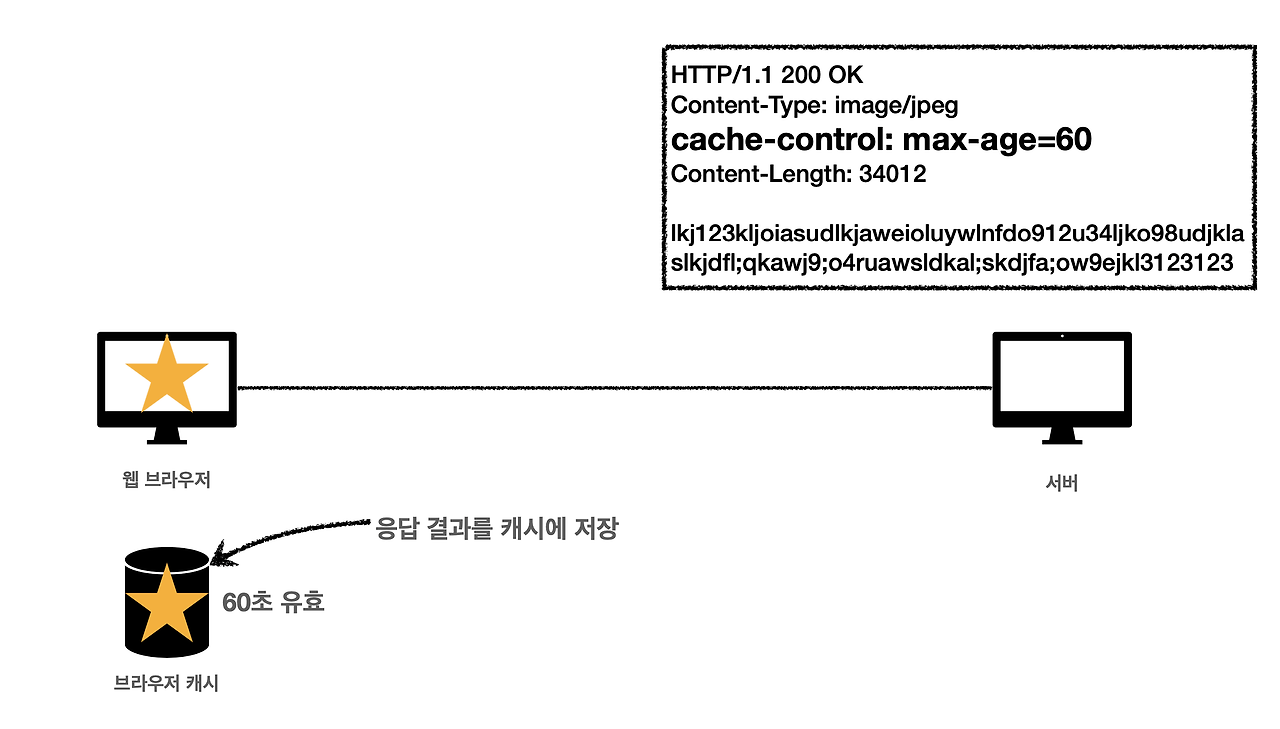 클라이언트에서 star.jpg를 서버에 요청한다고 가정하면 서버는 요청 내용을 보고 실제 이미지인 star.jpg와 HTTP 응답을 내립니다. 이때 브라우저가 캐시를 적용해야 하니 캐시가 유효한 시간을 HTTP 헤더의 cache-control에 설정해서 응답을 보냅니다. 위의 예제처럼 cache-control: max-age=60으로 보내면 브라우저는 60초 동안 캐시에 저장하게 되며 이후 요청에서는 리소스를 받기 전에 캐시를 먼저 확인합니다.