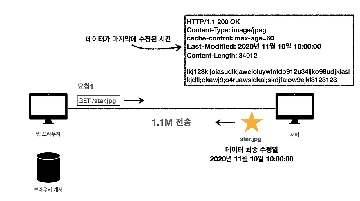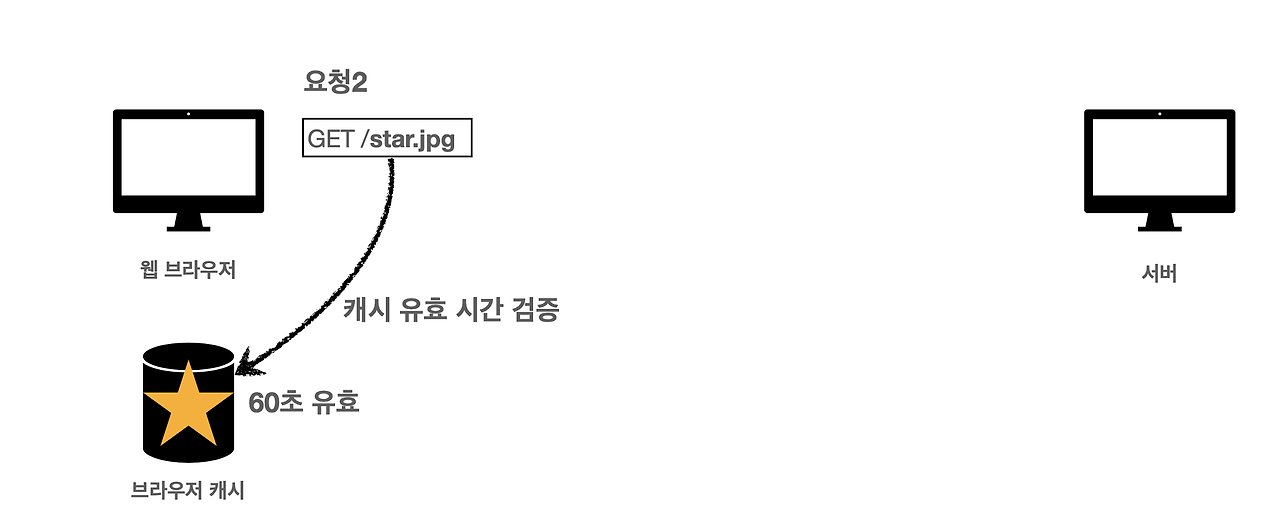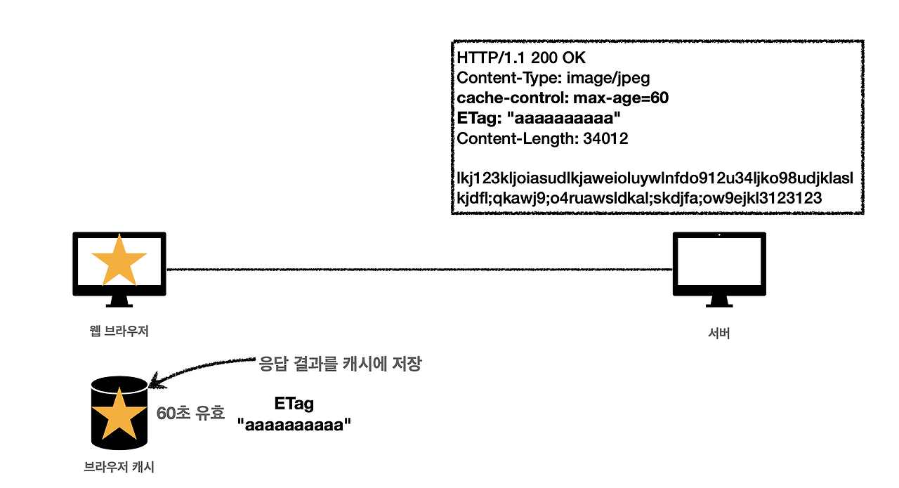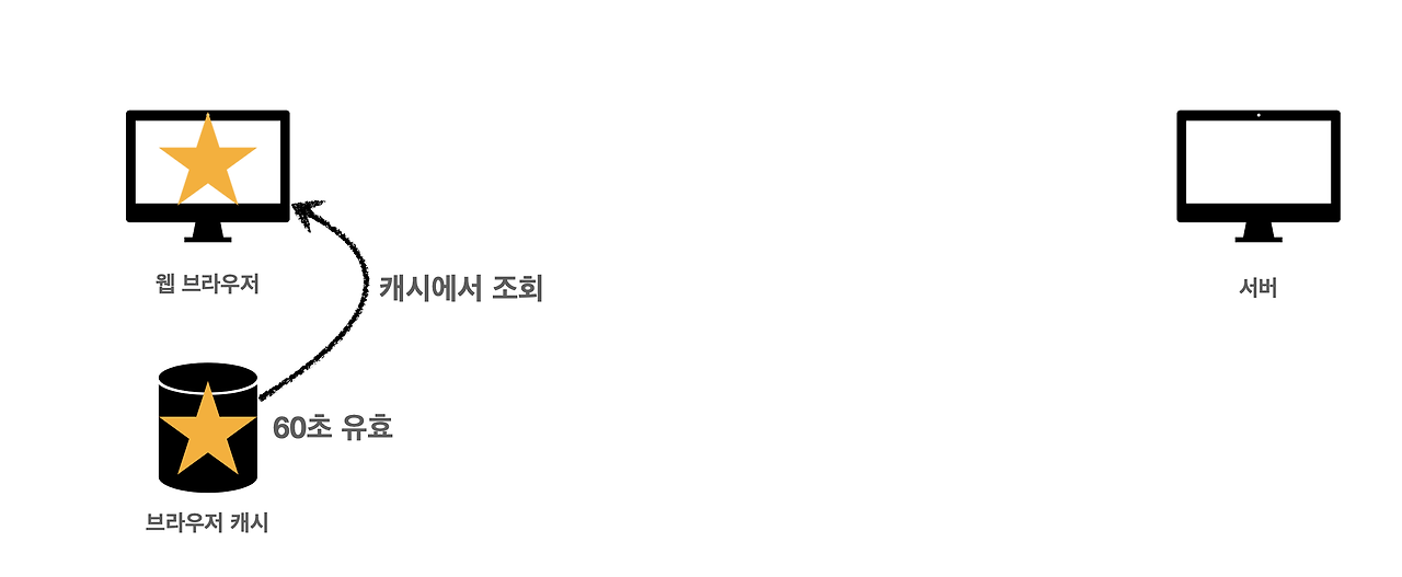 클라이언트에서 star.jpg를 서버에 요청한다고 가정하면 서버는 요청 내용을 보고 실제 이미지인 star.jpg와 HTTP 응답을 내립니다. 이때 브라우저가 캐시를 적용해야 하니 캐시가 유효한 시간을 HTTP 헤더의 cache-control에 설정해서 응답을 보냅니다. 위의 예제처럼 cache-control: max-age=60으로 보내면 브라우저는 60초 동안 캐시에 저장하게 되며 이후 요청에서는 리소스를 받기 전에 캐시를 먼저 확인합니다.