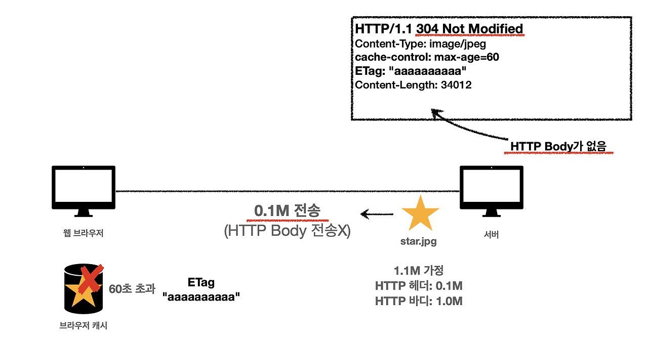 Last-Modified 대신 ETage(Entity Tag)를 사용할 수도 있습니다. 이 경우에는 서버의 리소스에 임의의 엔티티 태그를 쌍으로 달아놓습니다. 그리고 리소스가 변경되면 이 엔티티 태그를 갱신하는 것이죠. 이 엔티티 태그는 클라이언트의 첫 요청 시 ETag라는 헤더에 값으로 클라이언트에 내려줍니다. 이후 캐시가 만료되었을 때 클라이언트가 서버에 if-None-Match 헤더에 ETag값을 보내고, 서버는 이 값을 리소스의 엔티티 태그와 비교하여 변경사항이 있는지 확인합니다. 변경사항이 있으면 200과 함께 데이터를 전송하고, 변경되지 않았다면 304 Not Modified를 응답하여 불필요한 낭비를 막을 수 있습니다.