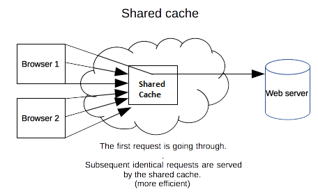 - 공유 캐시 : 대표적으로 프록시 캐시를 말합니다. 중간에 위치한 프록시 서버에 리소스를 두고 자주 요청되는 리소스를 프록시 서버에서 캐싱하여 동일한 리소스에 대한 여러 클라이언트의 요청에 대응합니다.