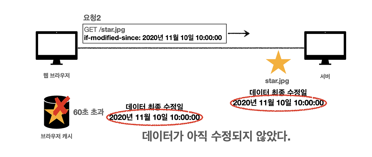 생각해 보면 서버의 리소스와 캐시에 있는 리소스가 같다는 사실만 알 수 있으면 무거운 리소스를 매번 갱신해줘야 할 이유는 없습니다. 첫 요청 시 서버에서 Last-Modified라는 헤더에 리소스의 최종 변경일을 설정하면 캐시의 유효기간이 지난 뒤 클라이언트에서 서버로 리소스를 요청할 때 if-modified-since 헤더에 last-modified값 보내고 서버는 이 값을 서버에 있는 리소스의 데이터 최종 수정일을 비교하여 변경사항이 있는지 확인합니다. 변경사항이 있으면 200과 함께 데이터를 전송하고, 변경되지 않았다면 304 Not Modified를 응답하여 불필요한 낭비를 막을 수 있습니다.