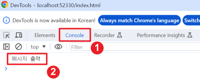 1. 자바스크립트에 console을 직접 넣을 수 있습니다. 이렇게 한다면 웹 사이트를 오픈할 때 콘솔창에 "메시지 출력"이라는 메시지가 출력되겠습니다.
