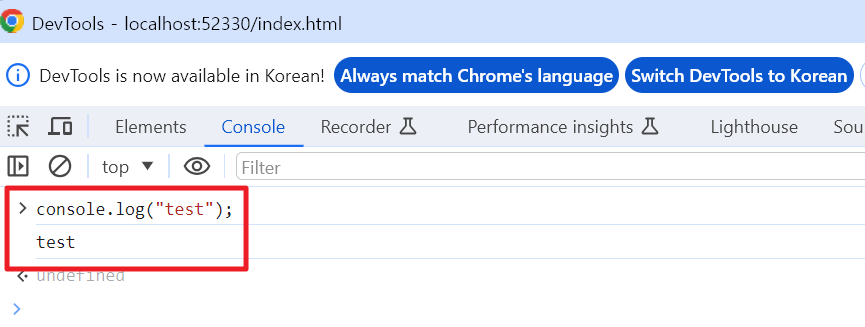 3. 애초에 자바스크립트 코드에 명령어를 미리 삽입하지 않아도 콘솔창에서 코드를 직접 입력하여 실행할 수 있습니다. 콘솔창에서 위와 같이 console.log("test")라고 입력하면 결과값으로 문자열 "test"가 출력됩니다.