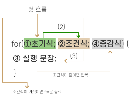 - 초기식 : 반복문에 사용될 변수 초기화 및 설정이 이루어집니다. 처음에 한 번 실행됩니다.