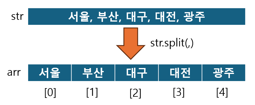 위의 예제는 문자열을 구분자(쉼표 , )로 나누어 배열로 반환받는 예제입니다. arr이라는 배열을 출력해보면 쉼표를 구분자로 각 배열의 인덱스에 문자열이 쪼개져서 들어간 것을 확인할 수 있습니다.