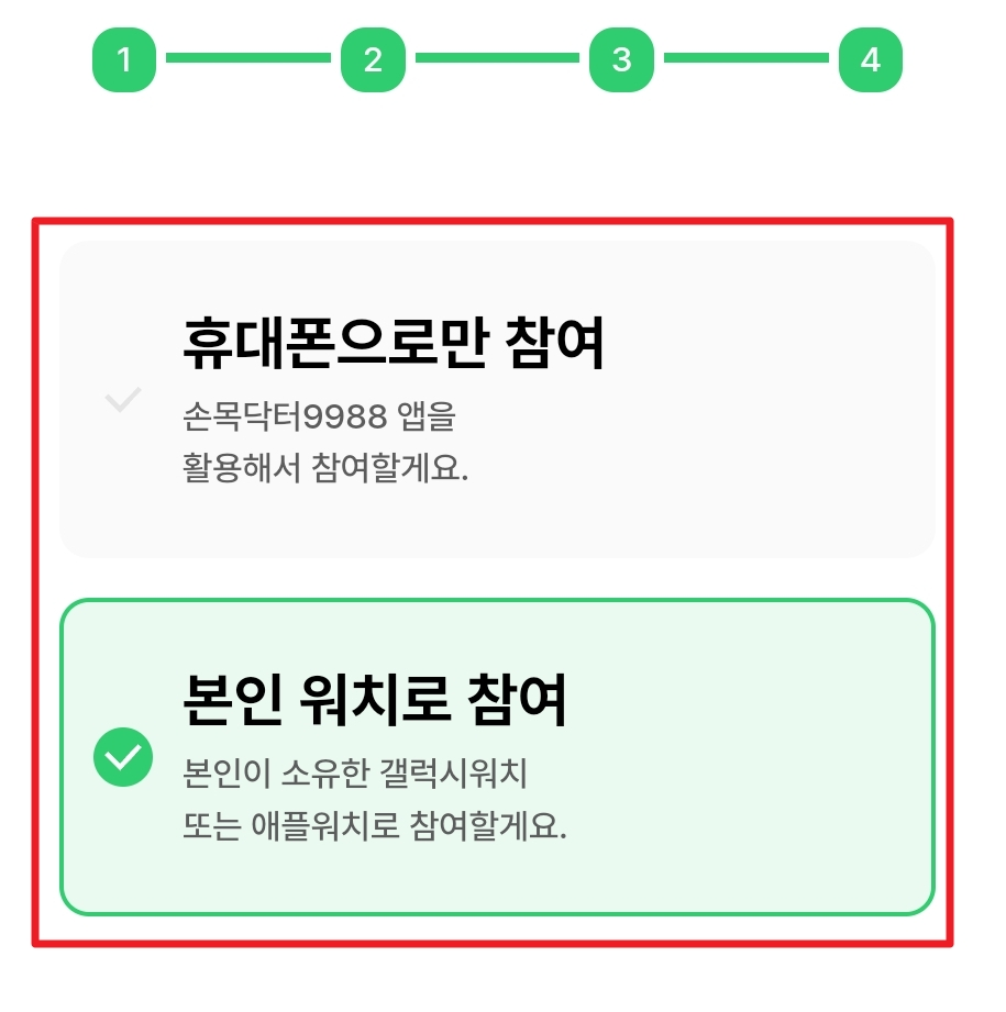 5. 본인 소유의 워치가 있으시면 "본인 워치로 참여"를 누르시면 되고, 없으시다면 휴대폰으로만 참여하시면 됩니다. 워치가 없어도 손목닥터 9988의 거의 모든 서비스를 사용할 수 있습니다.