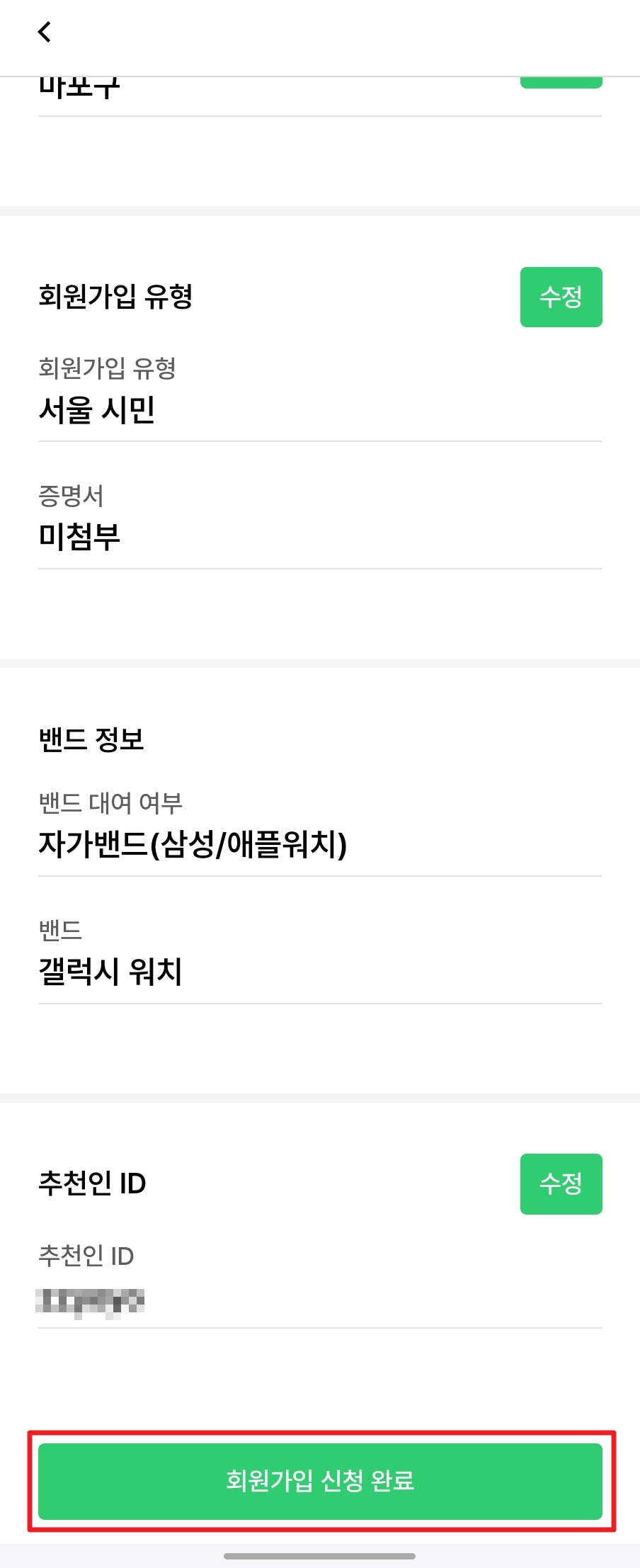 6. 마지막으로 내가 쓴 정보를 입력한 후 회원가입 신청 정보 완료를 입력합니다. 추천인이 있으시다면 여기 입력해 주시면 됩니다. 없으시다면 제 ID인 "wjdxo513"을 입력해 주세요.