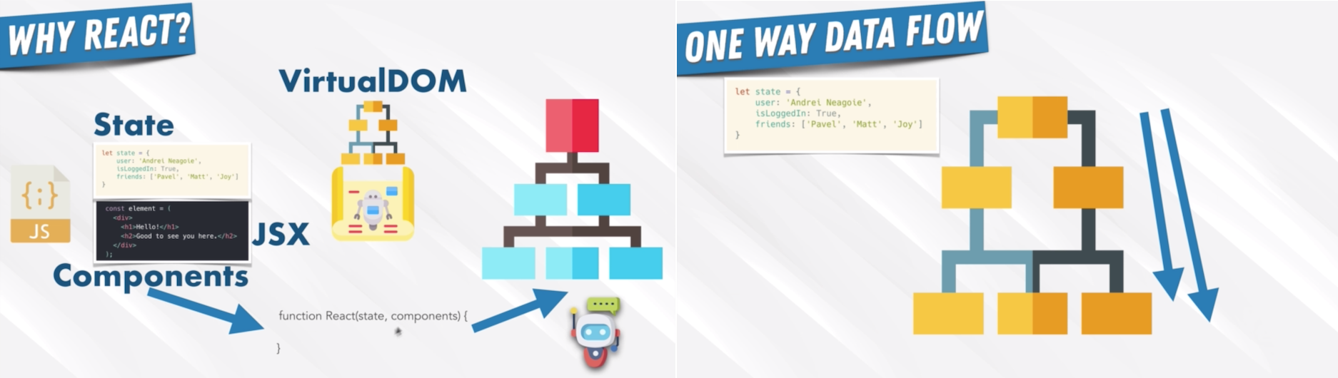 이 Single Page Application을 지원하는 프레임워크는 React전에도 존재는 했었습니다. 대표적인 게 Angular.js입니다. 하지만 이걸로는 비대해진 웹 서비스를 제대로 컨트롤하기가 어려웠습니다. 특히 시간이 지날수록 웹 서비스의 복잡성이 증가함에 따라 클라이언트와 서버 간의 HTTP 요청이 폭증했고, 이 요청들의 데이터의 흐름이 어디로 이어지는지 파악하기가 너무 어려웠는데요. 디버깅도 덩달아 어려워졌죠. 복잡한 UI와, 화면에 데이터를 계속 뿌려줘야 하는 페이스북도 이와 비슷한 문제를 겪었습니다. 그래서 자체 개발한 라이브러리가 바로 React입니다. Reqct는 위에서 문제가 되었던 것을 방지하고자 개발되었기 때문에 데이터가 어디서 어떻게 흐르는지 알기 쉬운 장점을 가지고 있습니다. 그래서 현재도 많이 사용되고 있죠.