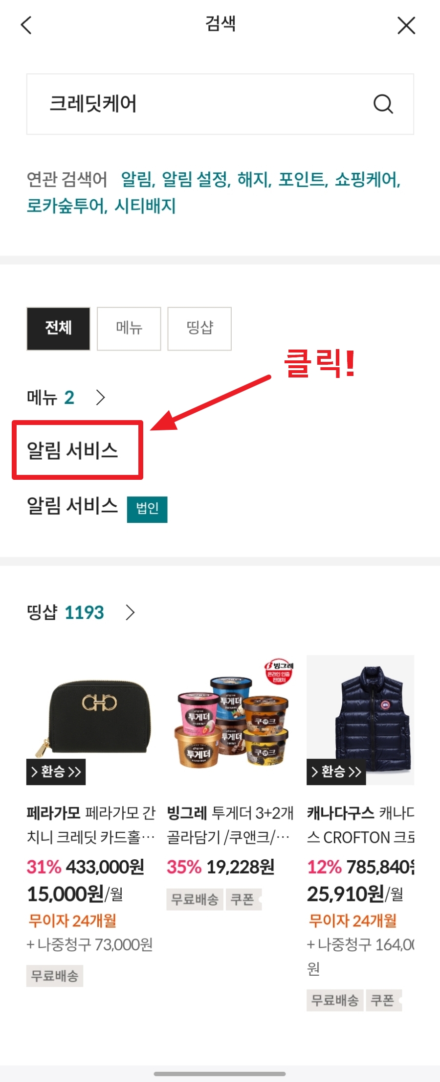 메뉴검색 입력란에서 "크레딧케어"를 입력해 주시면 메뉴가 2개 나올 거예요. 그중 위에 있는 "알림 서비스"를 클릭해 주세요.