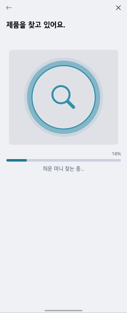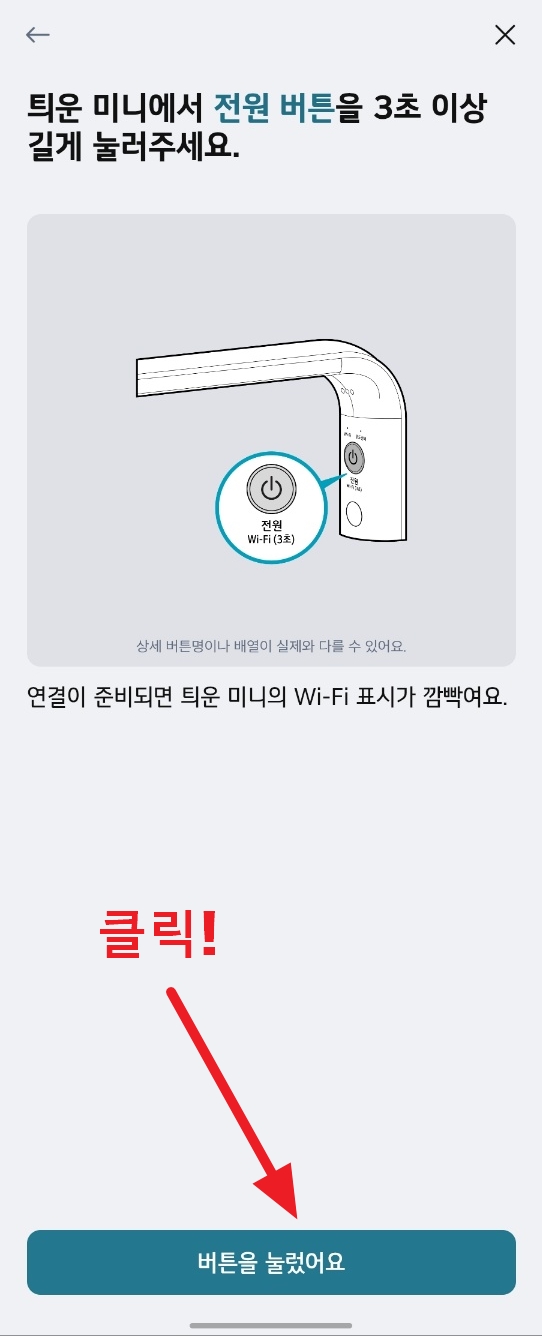 3. 틔운 미니가 검색되었다면 틔운 미니 본체의 전원 버튼을 3초 이상 꾹 눌러줍니다. 그럼 WIFI가 깜빡깜빡거릴 텐데 그때 "버튼을 눌렀어요"를 누르시면 됩니다. 제품과 연결 중에 WIFI 연결 팝업이 뜨면 연결버튼을 눌러주세요.