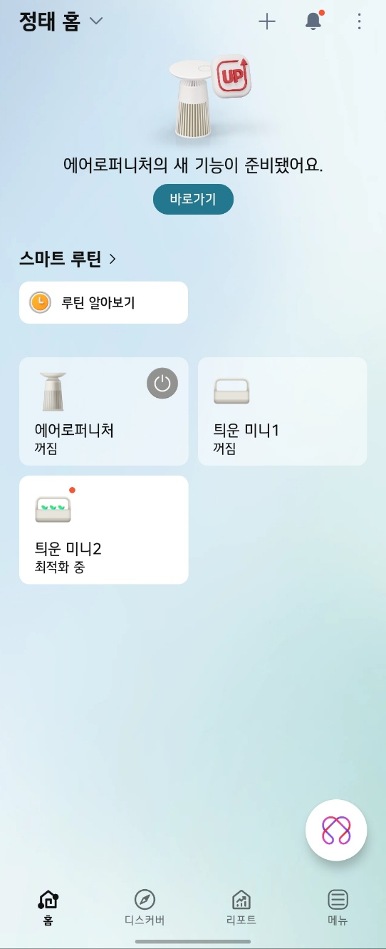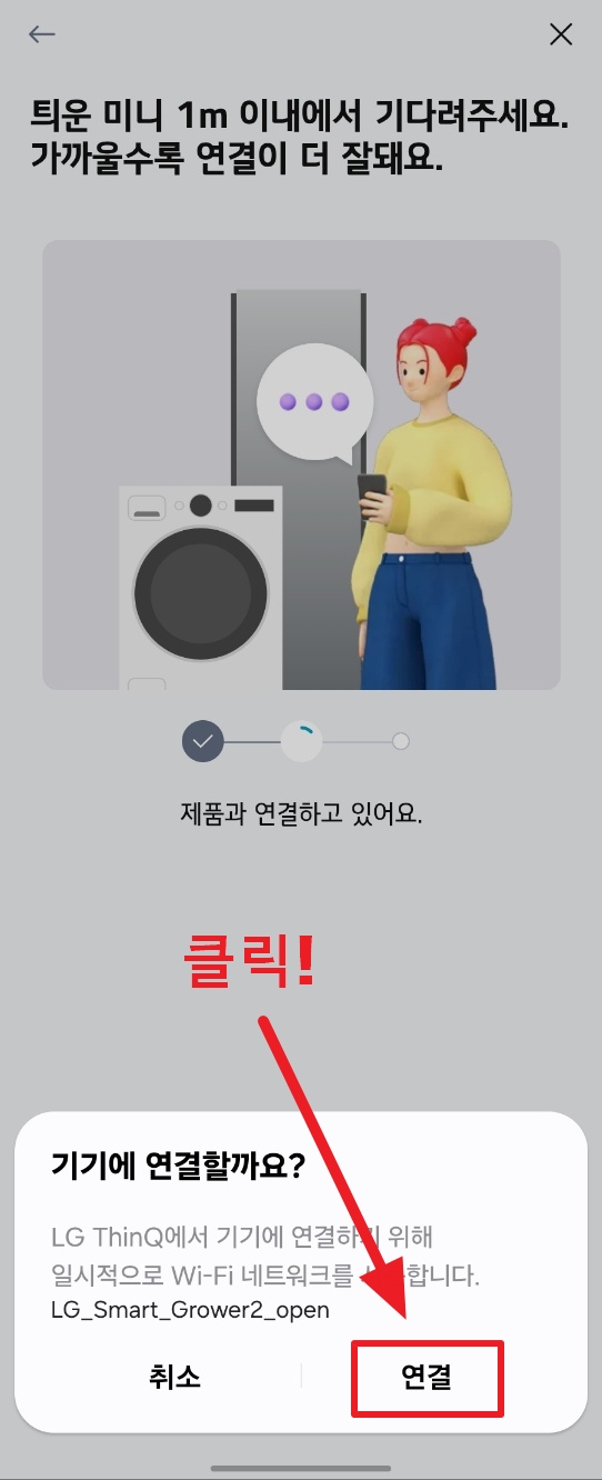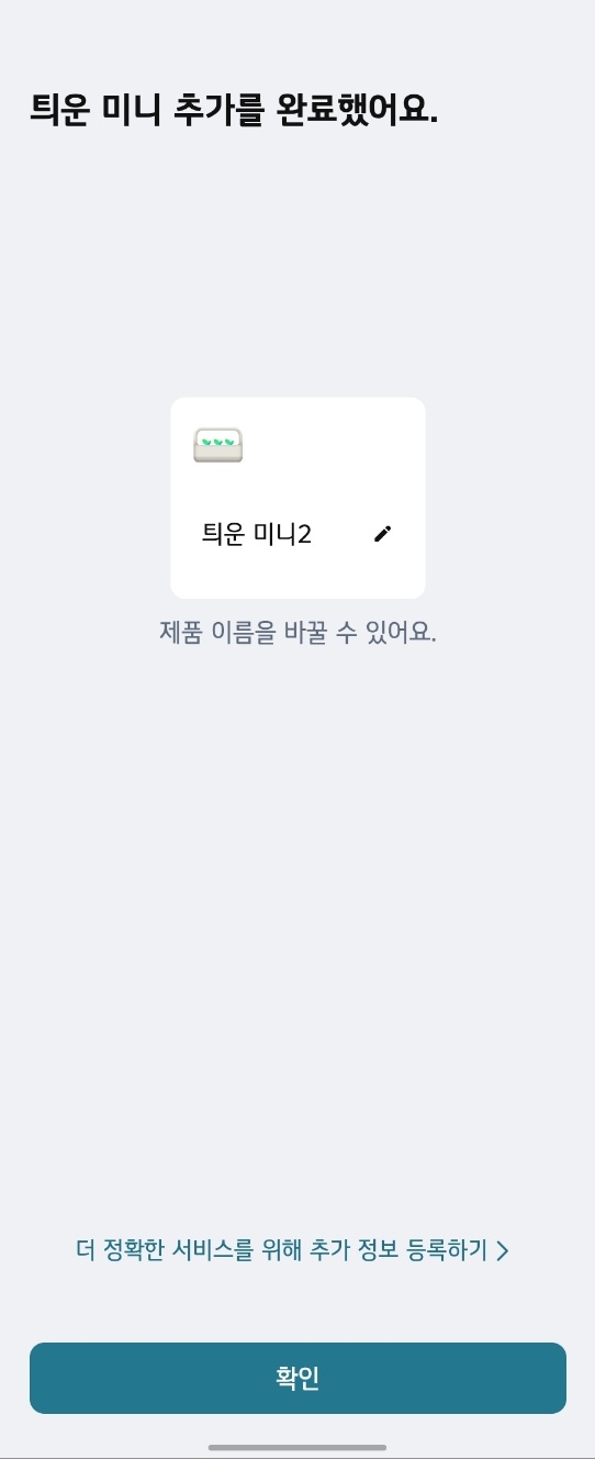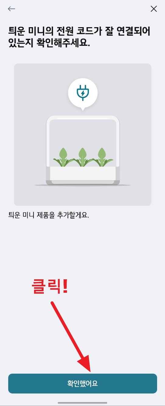 2. LG 씽큐 어플에서 "틔운 미니 제품을 추가할게요." 문구가 나오면 확인했어요 버튼을 눌러줍니다. 그럼 자동으로 근처에 등록되지 않은 틔운 미니를 찾을거에요.