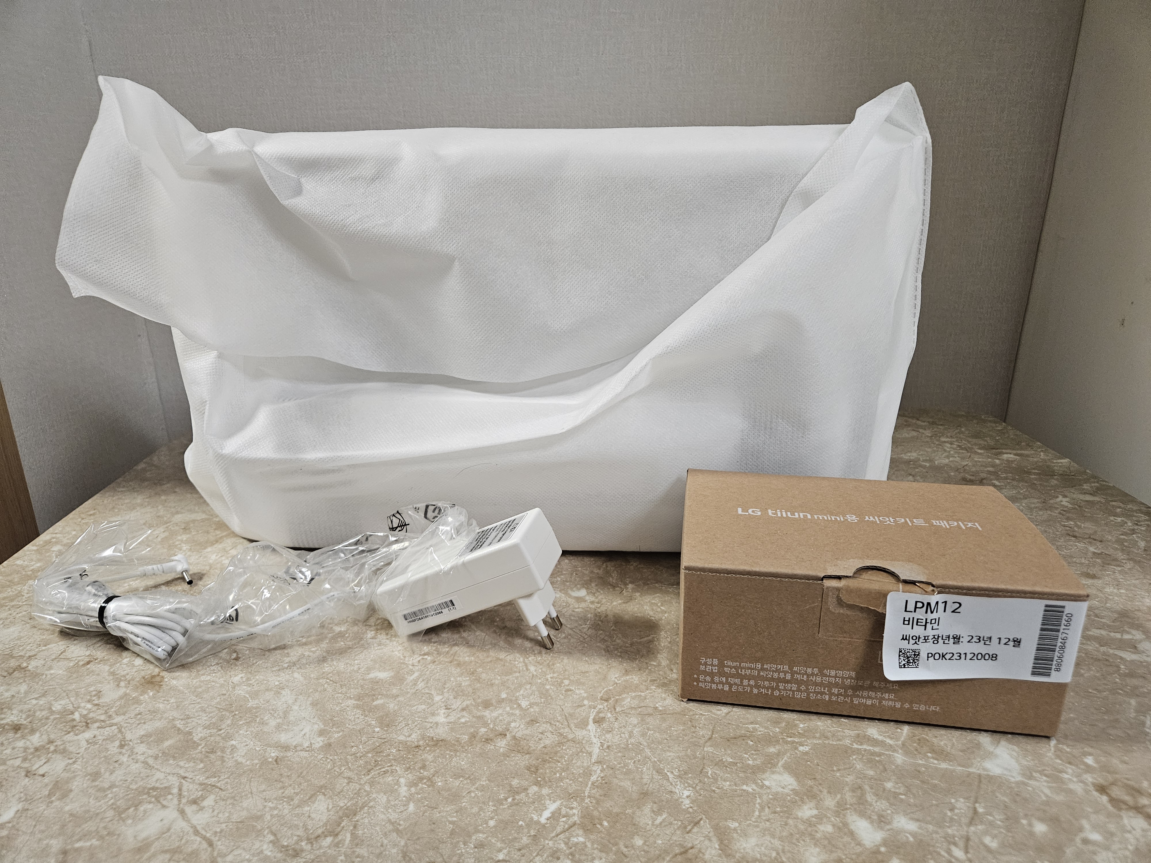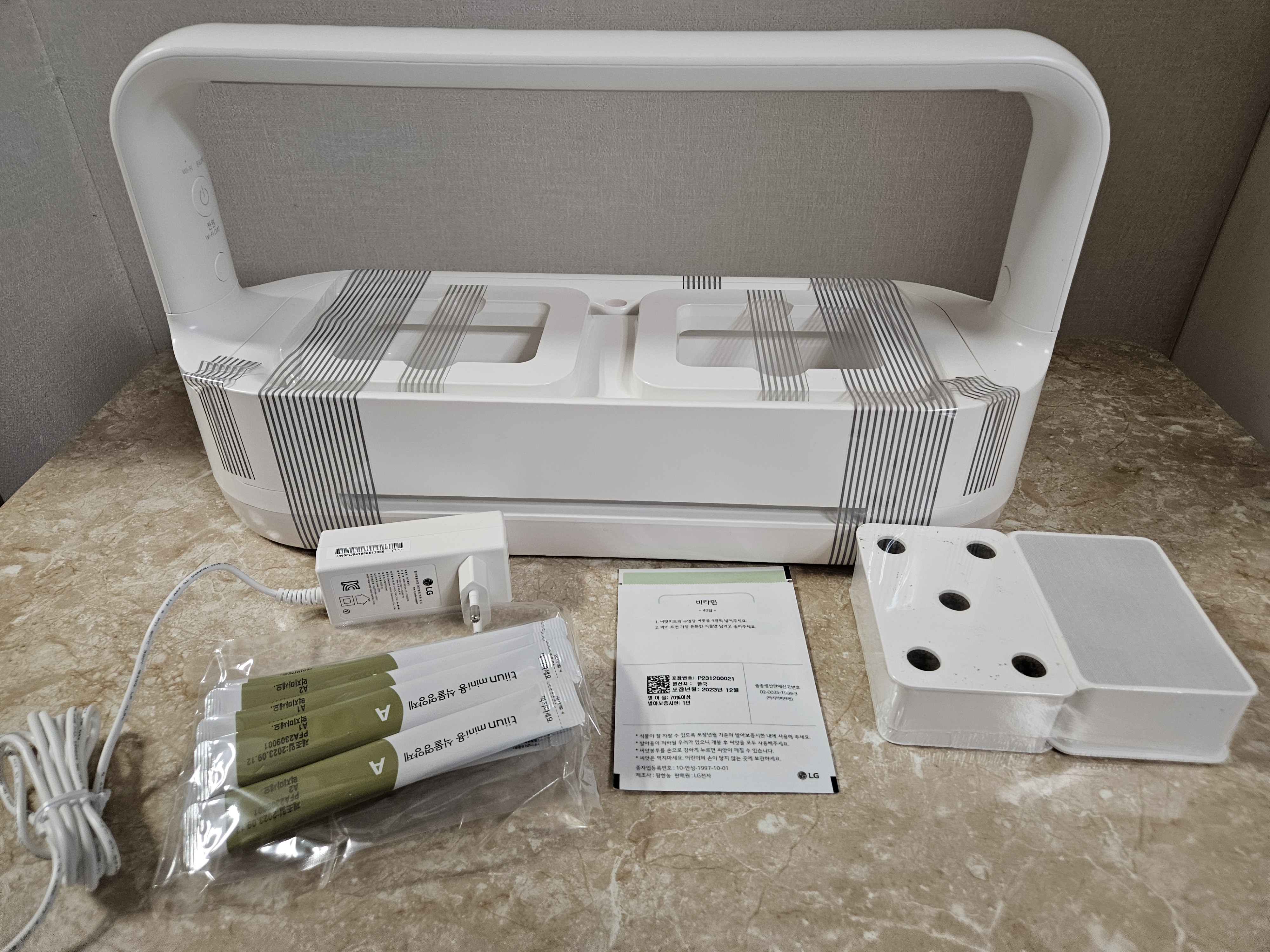 틔운 미니는 거대한 박스에 포장되어오네요. 박스를 열어보니 내부 포장이 깔끔하게 되어 있었습니다. 참고로 제가 구매한 모델명은 "L023E1"으로 틔움 2세대 아이보리 색상이에요. 2세대부터는 이렇게 전원 어뎁터가 흰색으로 나오네요.