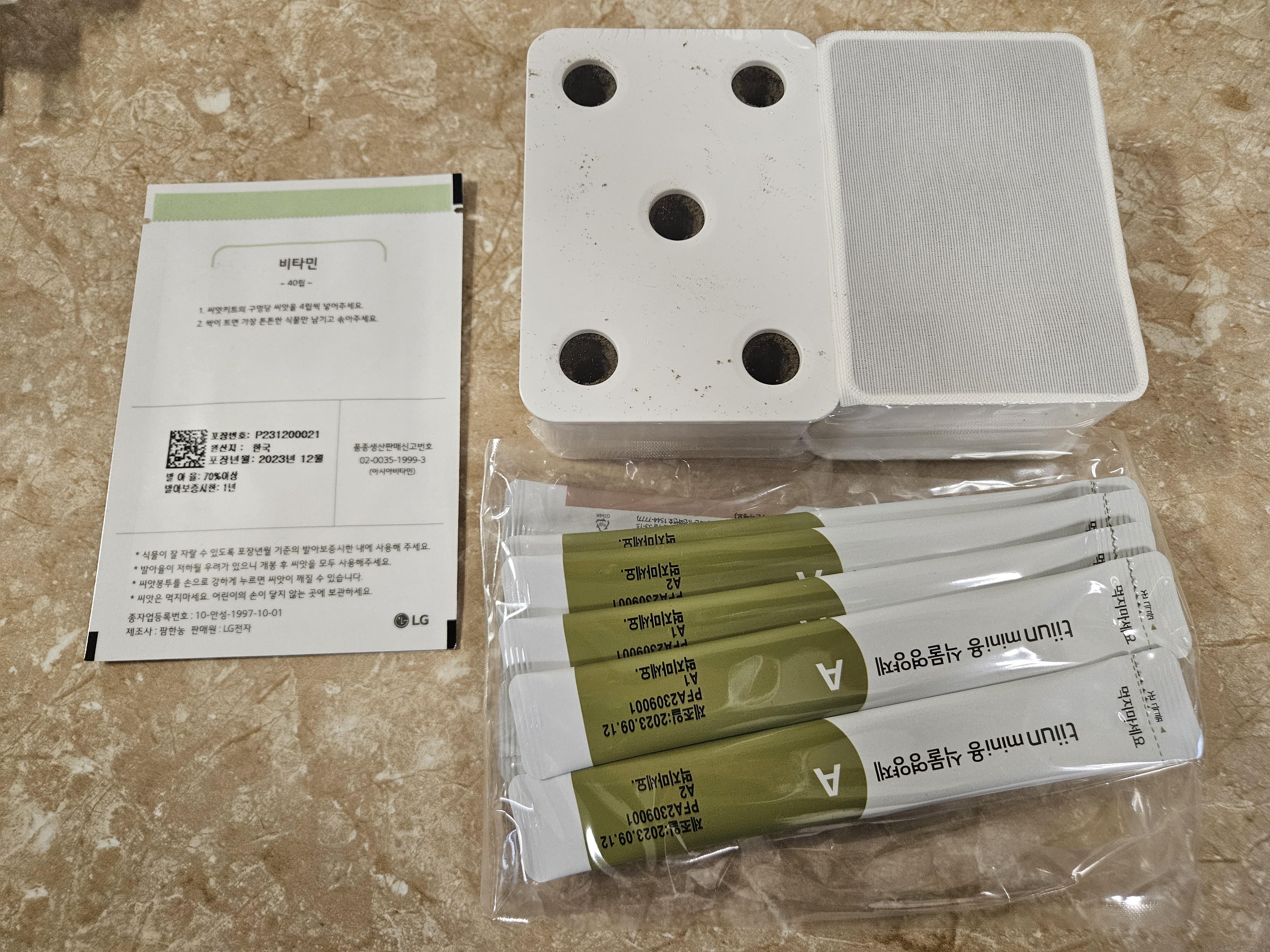 저는 초기 키트로 비타민을 선택했는데요. 구성은 재배키트와, 씨앗, 영양재로 구성되어 있습니다. 식물 재배가 처음이라면 어떻게 사용해야 할지 잘 모르실거 같아요. 제가 설명하는 것보다는 아래 LG에서 제공하는 사용 가이드 영상을 첨부할 테니 참고해 주세요.