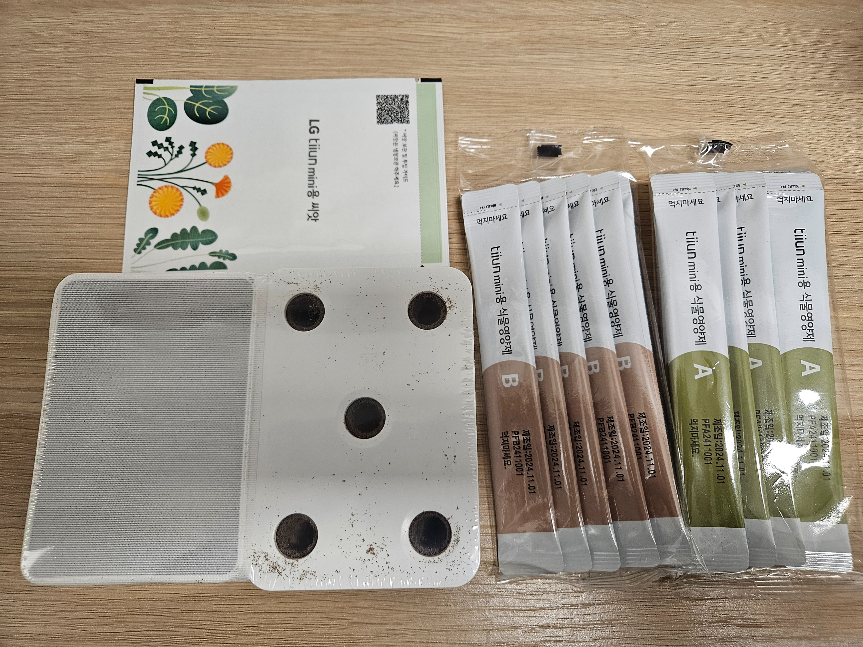 이번에 쿠팡으로 LG 틔운 미니의 청치마 상추 씨앗 키트를 구매했습니다. 쿠팡이 가격도 저렴하고 로켓배송이라서 제일 좋은 것 같아요. 씨앗키트 패키지에는 씨앗, 영양제, 그리고 재배키트가 포함되어 있습니다.