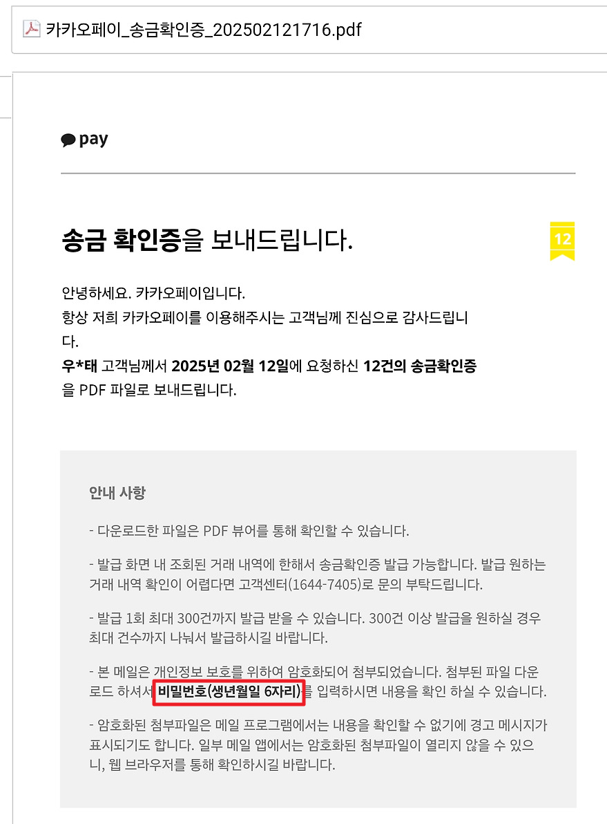 5. 아까 입력했던 이메일로 가서 송금확인증 메일을 연 뒤 첨부파일로 온 송금확인증 pdf를 다운로드하여서 열면 됩니다. 패스워드는 yymmdd 생년월일 6자리예요.