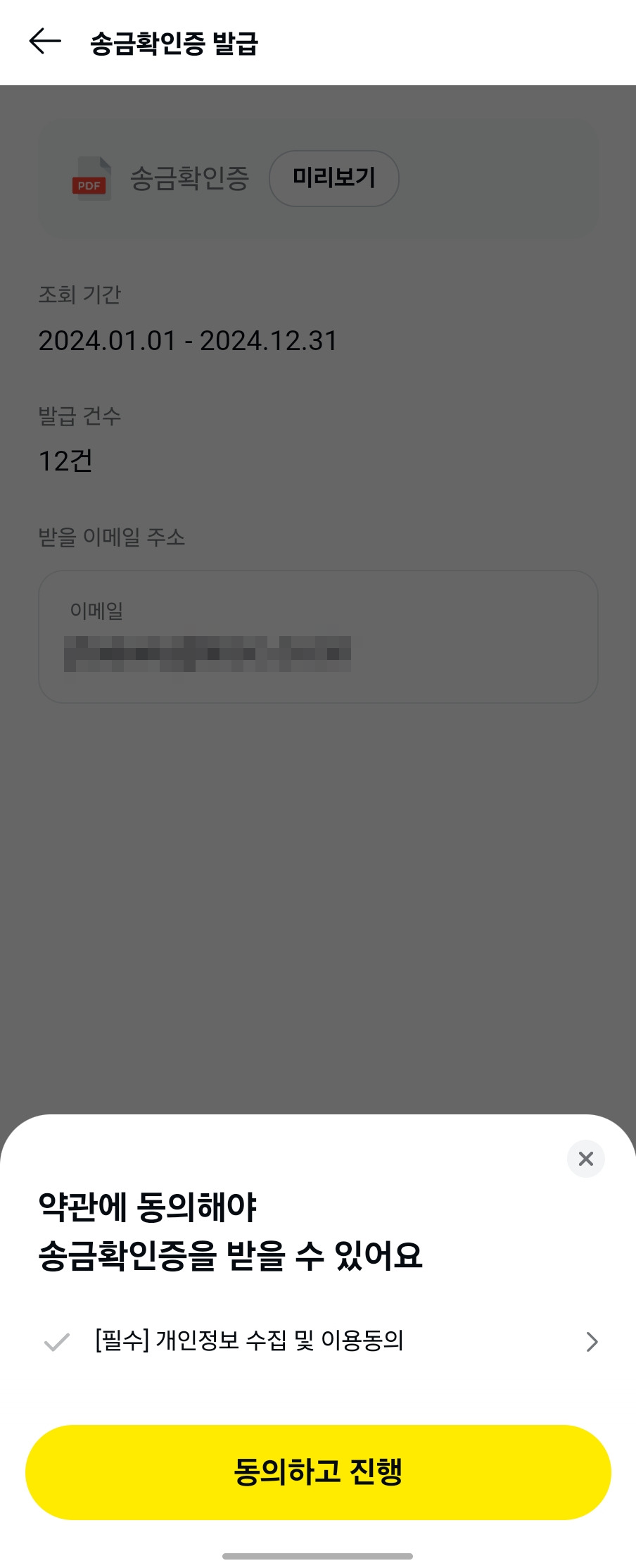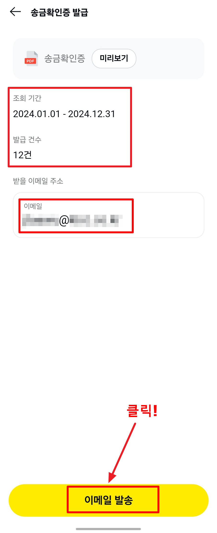4. 송금확인증을 받을 이메일을 입력한 후 "이메일 발송" 버튼을 클릭합니다. 그런 뒤 약관에 동의하시고 진행 버튼 클릭하시면 송금확인증이 이메일로 전송됩니다.