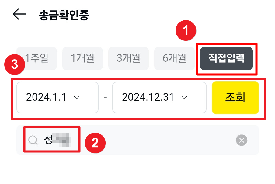 2. 송금확인증에서 직접입력을 선택하고 기간과 월세를 보낸 임차인 성함을 입력한 후 조회버튼을 클릭합니다.