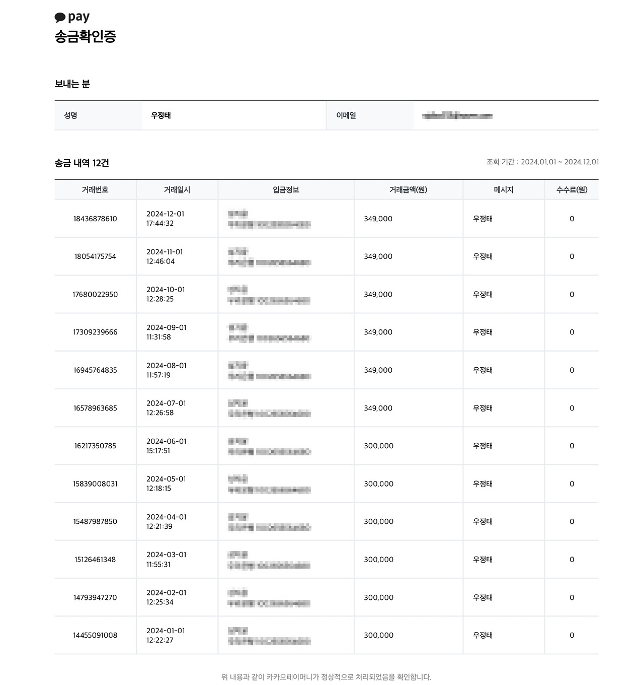 6. 해당 송금영수증을 연말정산 시 제출하시면 됩니다. 이렇게 카카오페이로 월세를 보내면 쉽게 월세증명서를 발급할 수 있으니까 연말정산 시즌이 다가오면 미리 준비하여 공제 혜택을 꼭 받아요.
