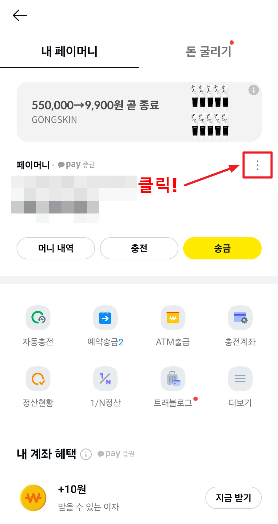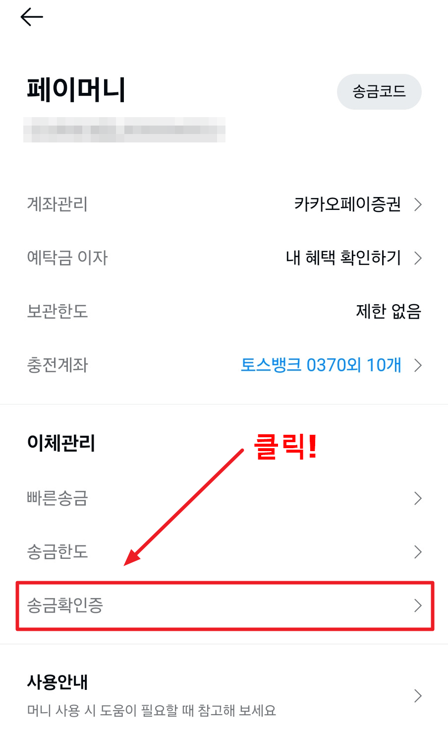 1. 카카오페이 → 페이머니 화면으로 들어가서 "페이머니" 우측에 있는 ··· 점 세개 아이콘을 클릭합니다. 그런뒤 목록에서 송금확인증을 선택해주세요.