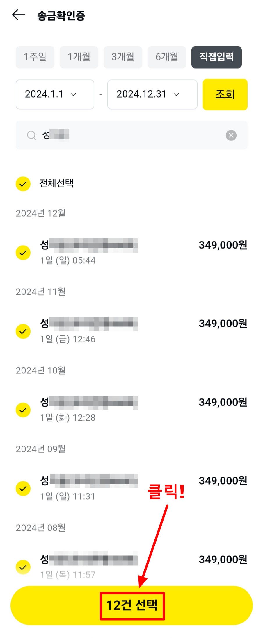 3. 그럼 이렇게 송금 리스트들이 나올 거예요. 저희는 연말정산용이니까 12건인지 확인하고 다음으로 넘어가줍시다.