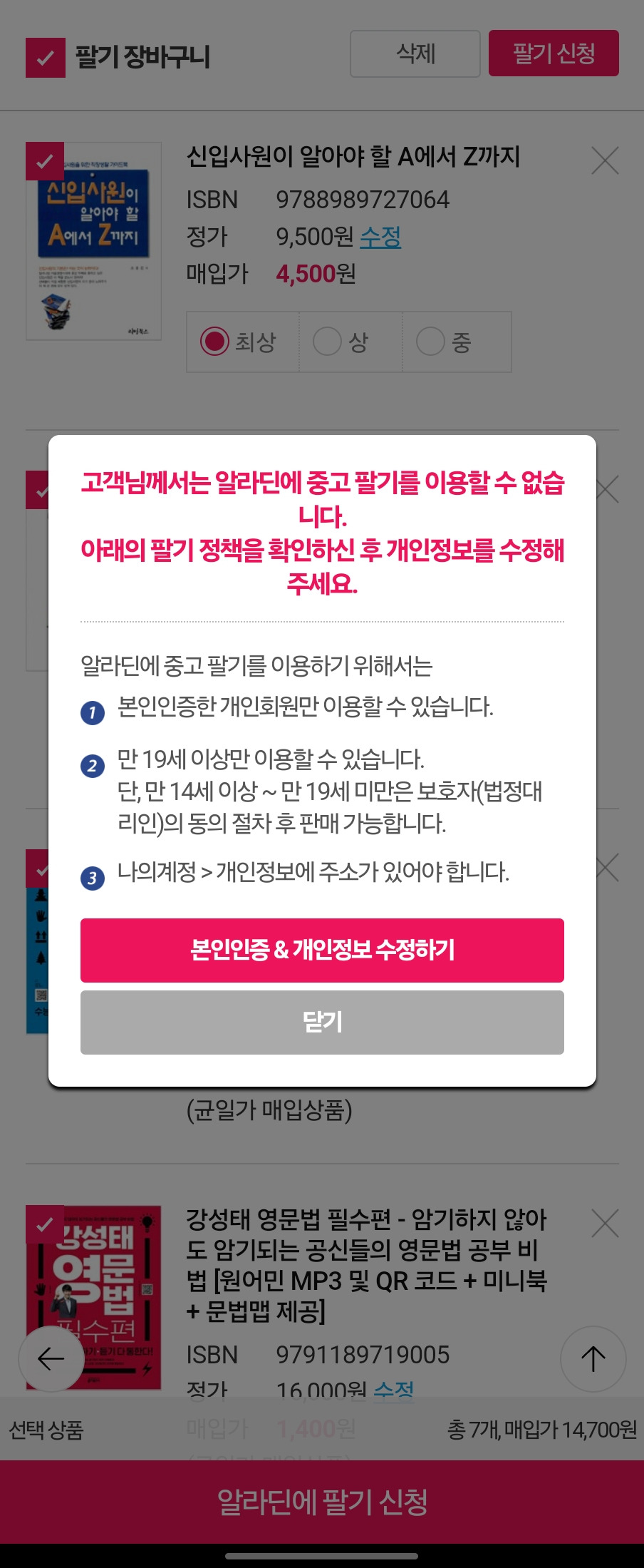 5. 이때 만약 이런 창이 뜬다면 본인인증을 수행하고 다시 프로세스를 진행해 주세요. 알라딘은 본인인증이 되어 있지 않은 고객들에게는 책을 매입하지 않습니다.