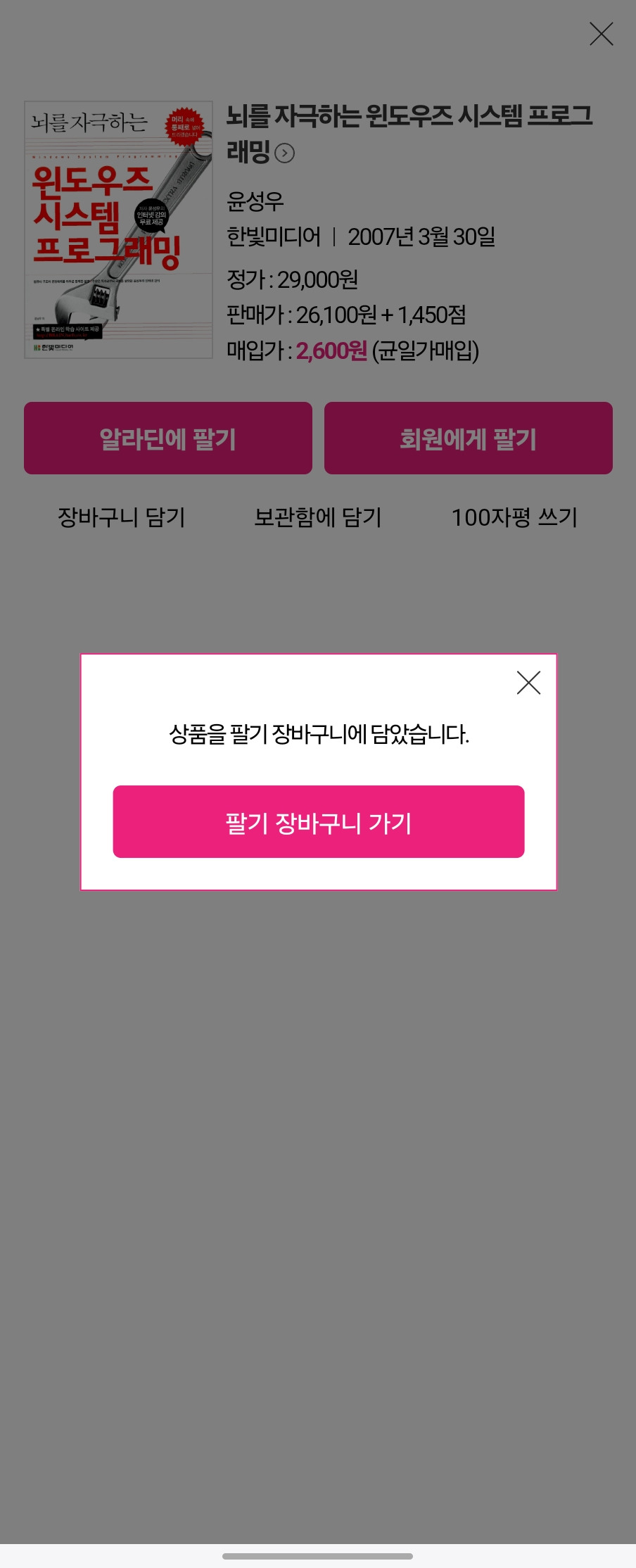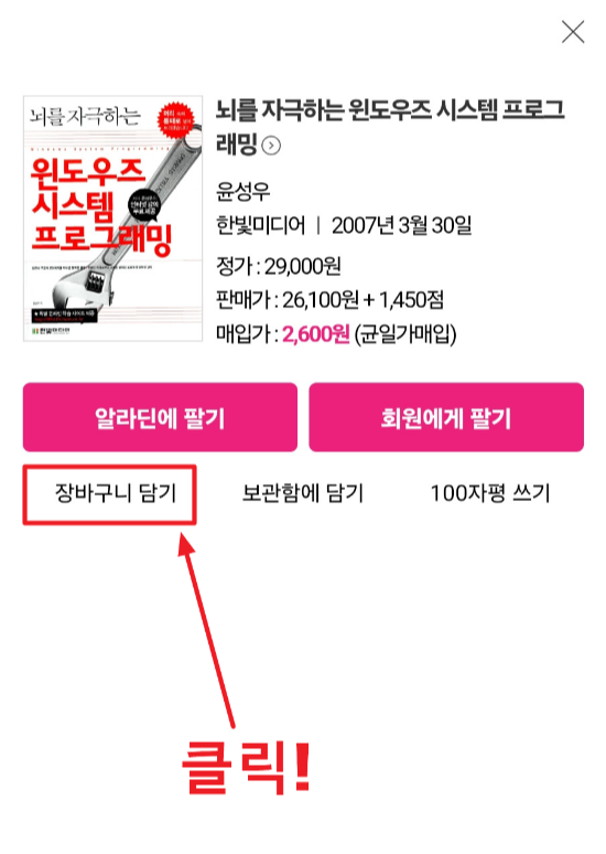 3. 만약 판매가 가능한 책이라면 이렇게 알라딘에 팔 수 있는 화면이 보여요. 저처럼 여러 개를 팔고 싶을 때는 장바구니 담기를 클릭하고 판매 할 책 스캔을 반복하시면 됩니다.