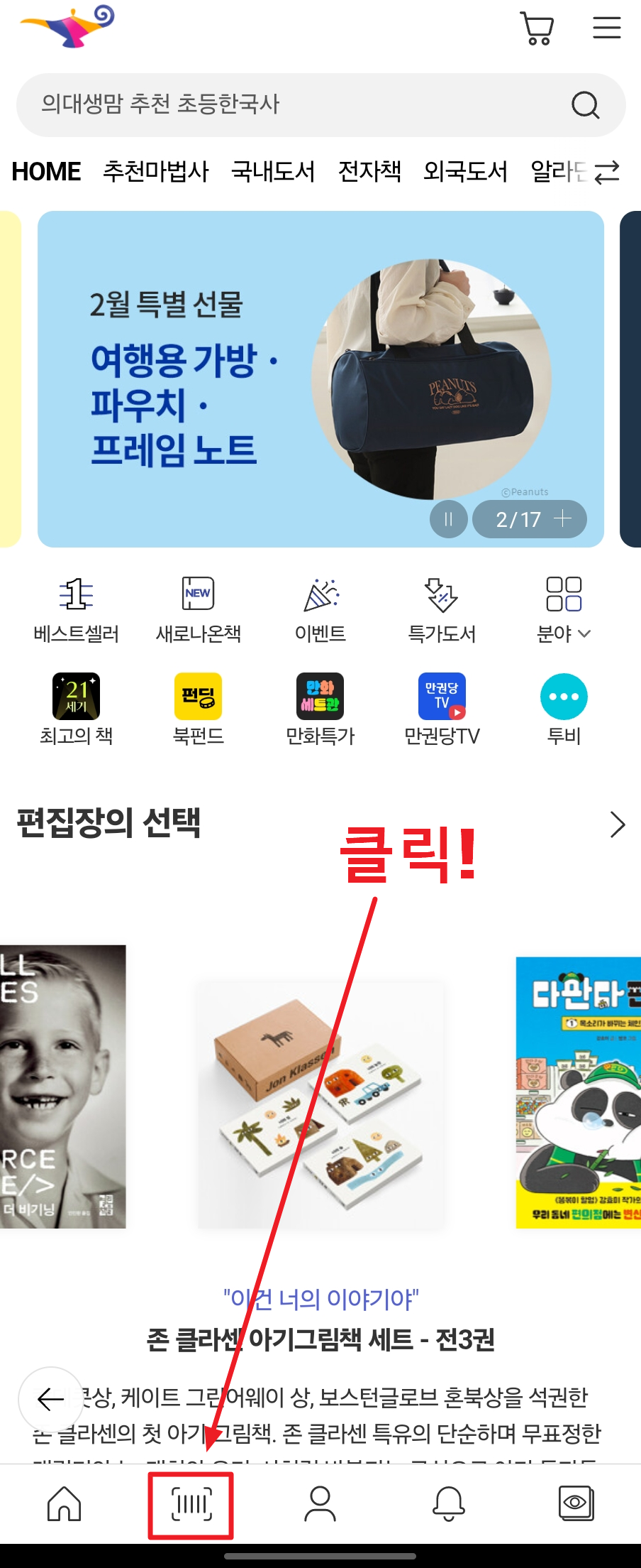 1. 먼저 앱스토어에서 알라딘 애플리케이션을 받으신 뒤 하단에 있는 바코드 버튼을 클릭해 주세요.
