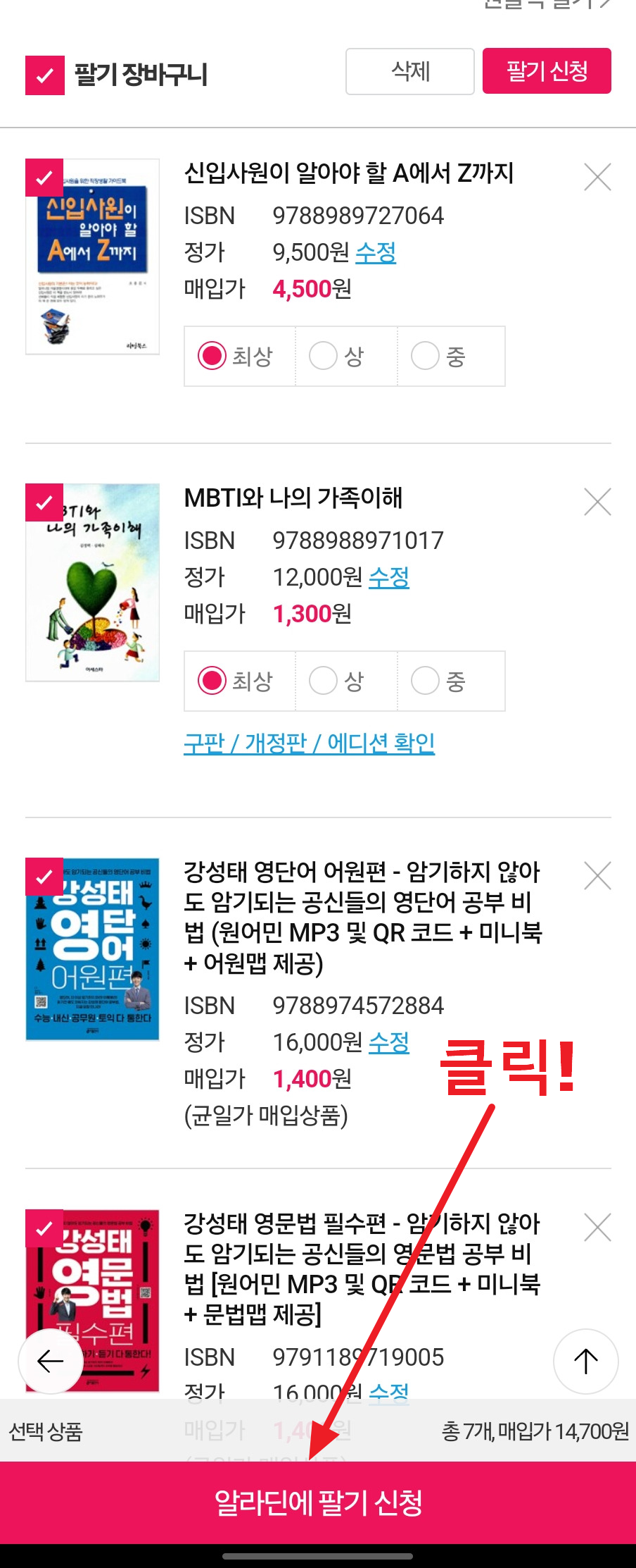 4. 장바구니에 판매할 책을 다 담았으면 "알라딘에 팔기 신청"을 클릭해 주세요.