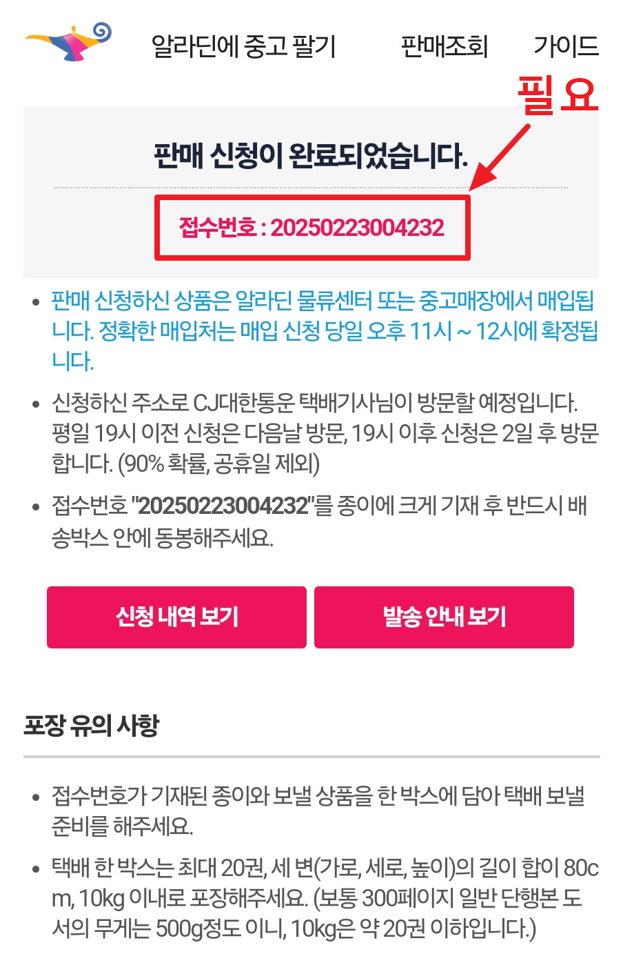 8. 판매할 책을 박스포장해주고, 접수번호를 적은 A4용지를 같이 동봉합니다. 저는 알라딘 지정 택배사를 선택해서 집 앞에다가 가져다 두니까 다음날 택배사가 알아서 가져갔습니다.