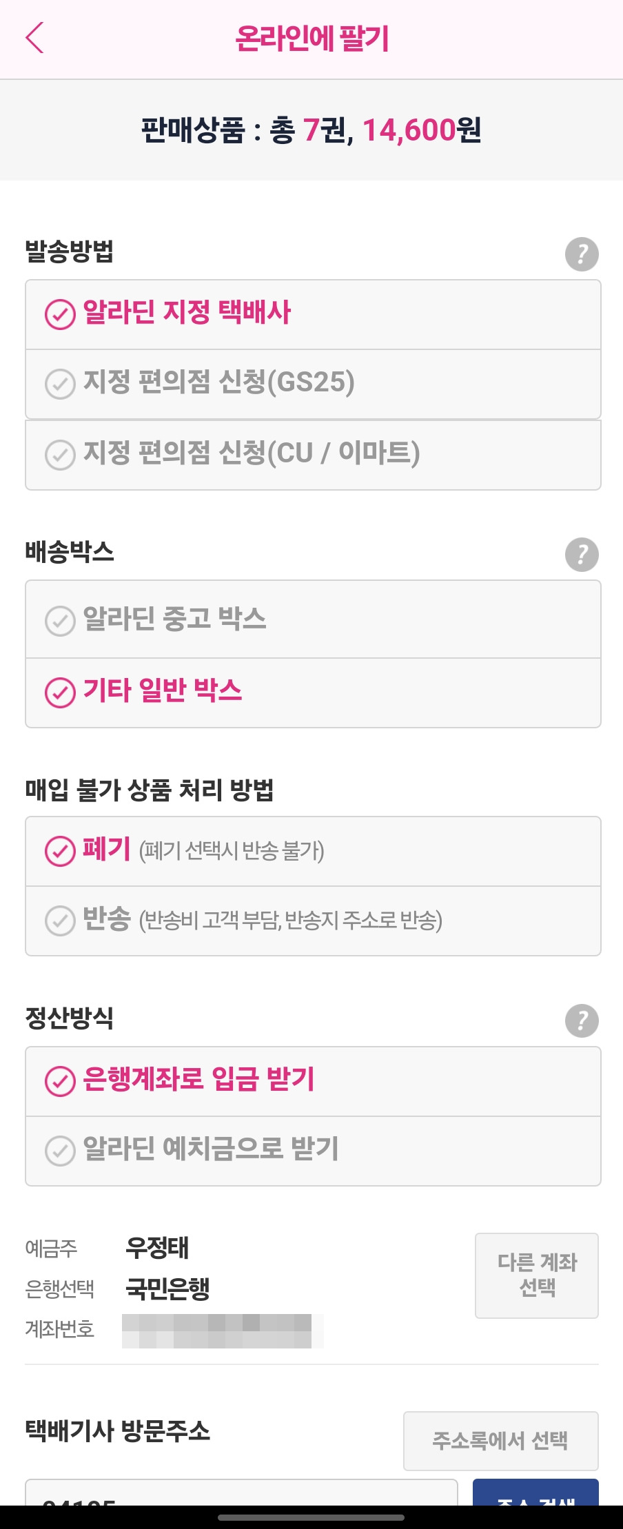참고로 배송박스는 "기타 일반 박스"로 진행하셔도 충분하고, 발송방법을 "알라딘 지정 택배사"로 하시면 그냥 문밖에다가 내놓으시면 택배사에서 다음날 알아서 가져가요. 너무 편리합니다.