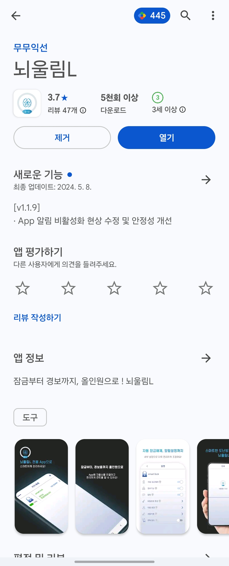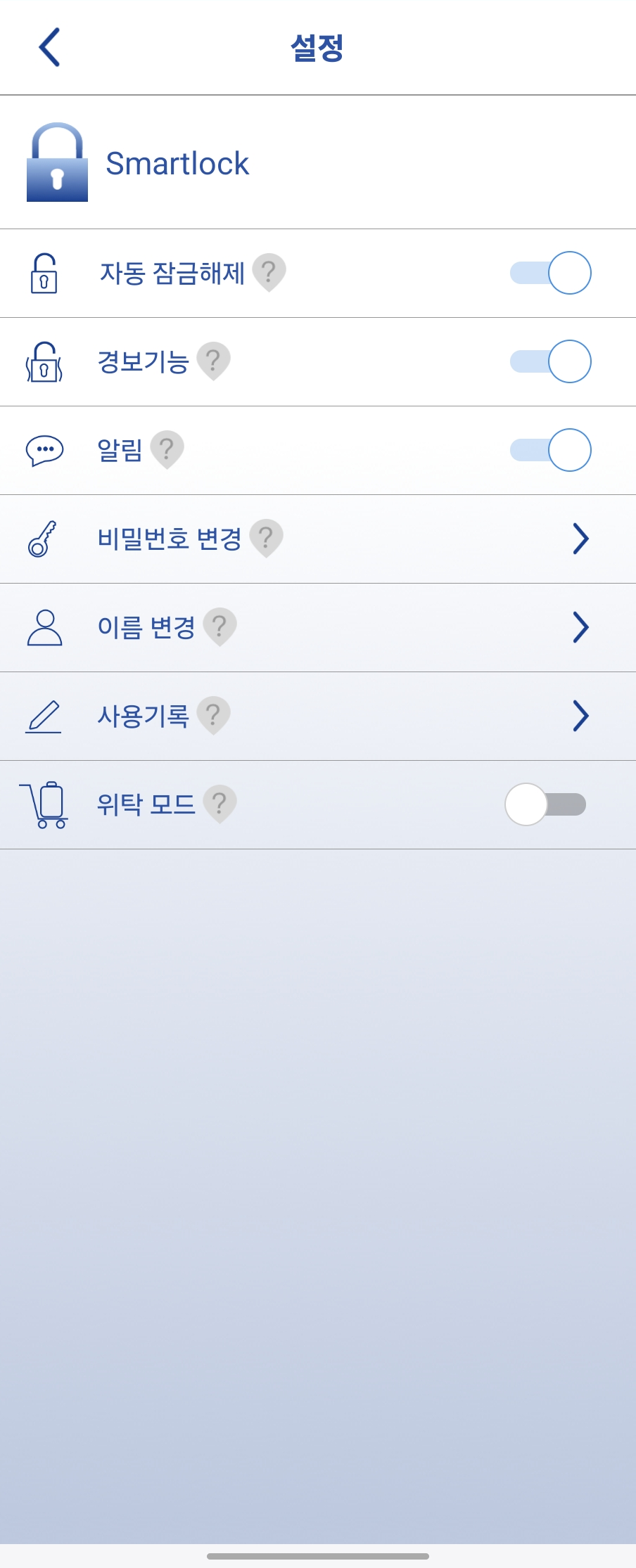 뇌울림 애플리케이션 설정탭에 보시면 자동 잠금해제, 경보기능, 알림 등을 ON / OFF 할 수 있습니다.