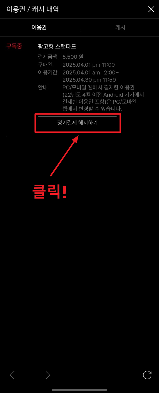 3. 이용권을 보시면 아래쪽에 "정기결제 해지하기" 버튼이 있을 거예요. 이걸 클릭해 주세요.