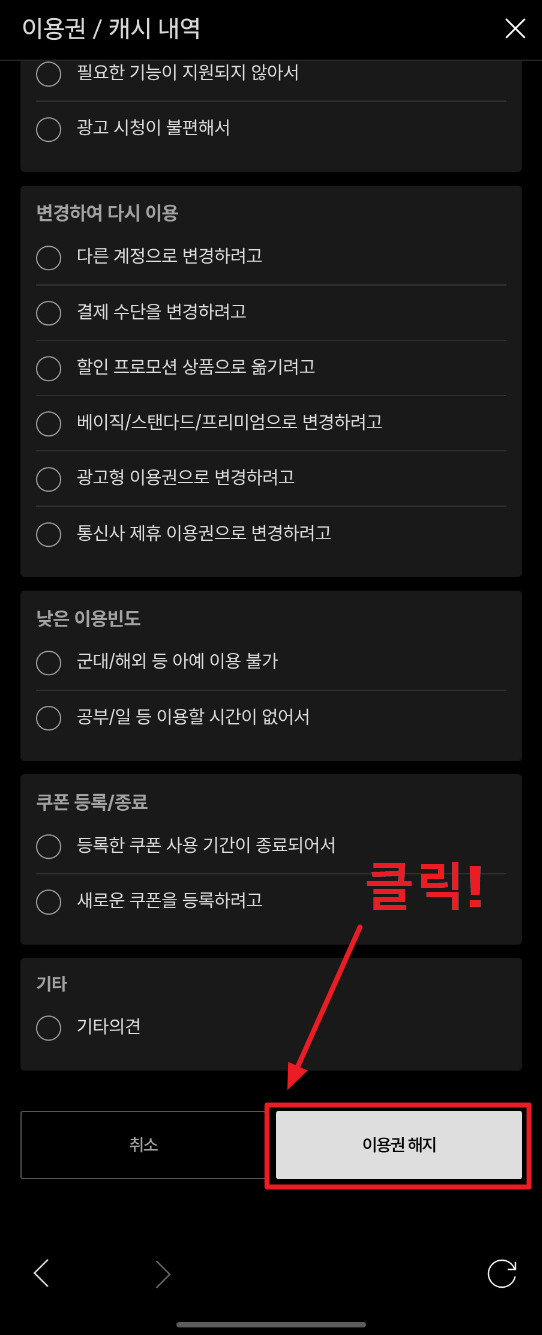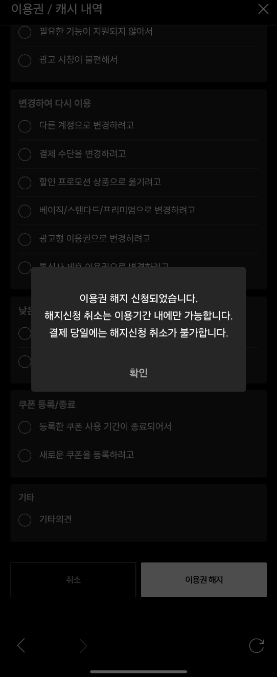 혹시나 "티빙 구독을 취소"를 취소하고 티빙 구독을 연장하고 싶으시다면 동일하게 마이페이지 이용권 / 캐시 내역에 들어가신 뒤 "해지신청 취소하기"를 클릭해 주시면 되세요. 참고로 결제당일에는 불가능하니까, 그때는 신규 구독을 해주시면 되겠습니다.