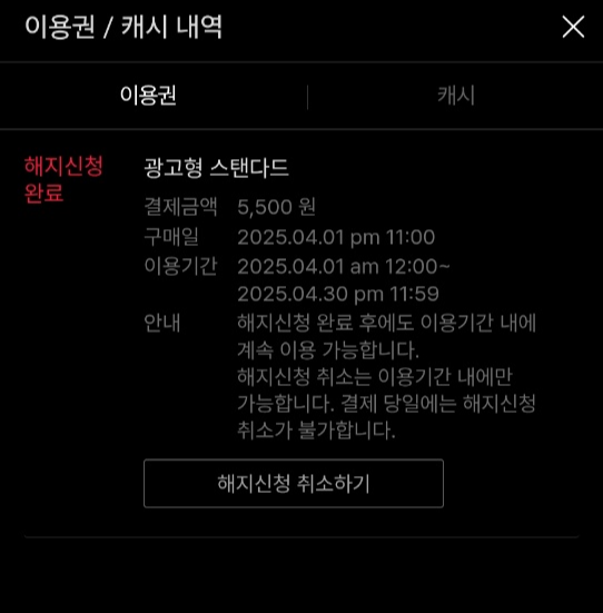 ex) 4월 1일에 해지했다면, 결제 주기가 4월 10일이라면 → 4월 10일까지는 시청 가능