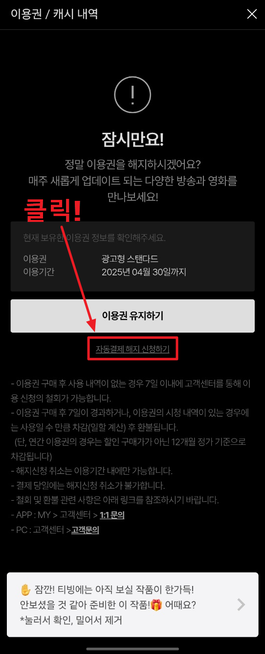 4. 이용권 유지하기 밑에 "자동결제 해지 신청하기" 글자가 있을거에요. 이걸 클릭해 주세요.