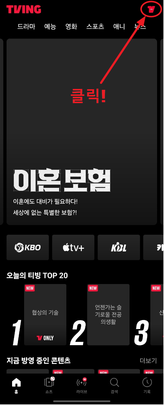 1. 티빙 우측 상단의 프로필 아이콘을 클릭하여 마이페이지에 들어갑니다.