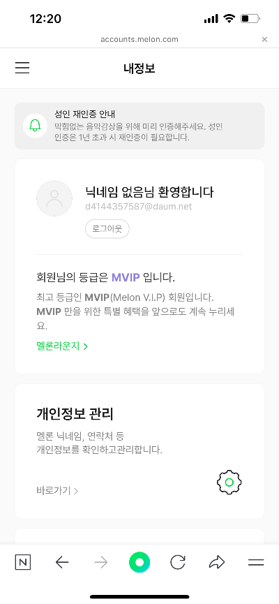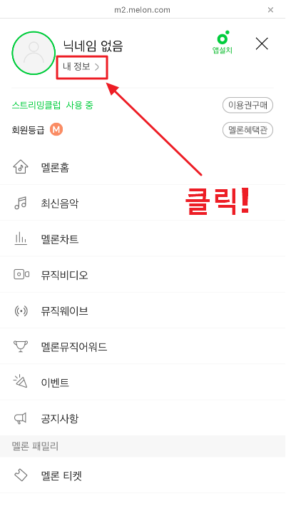1. 네이버에 "멜론"을 검색해서 멜론 웹으로 접속한 뒤 로그인을 하고, 우측 상단의 아이콘을 통해 "내정보"로 들어갑니다. [이용권 관리] 또는 [결제 관리] 메뉴를 찾습니다.