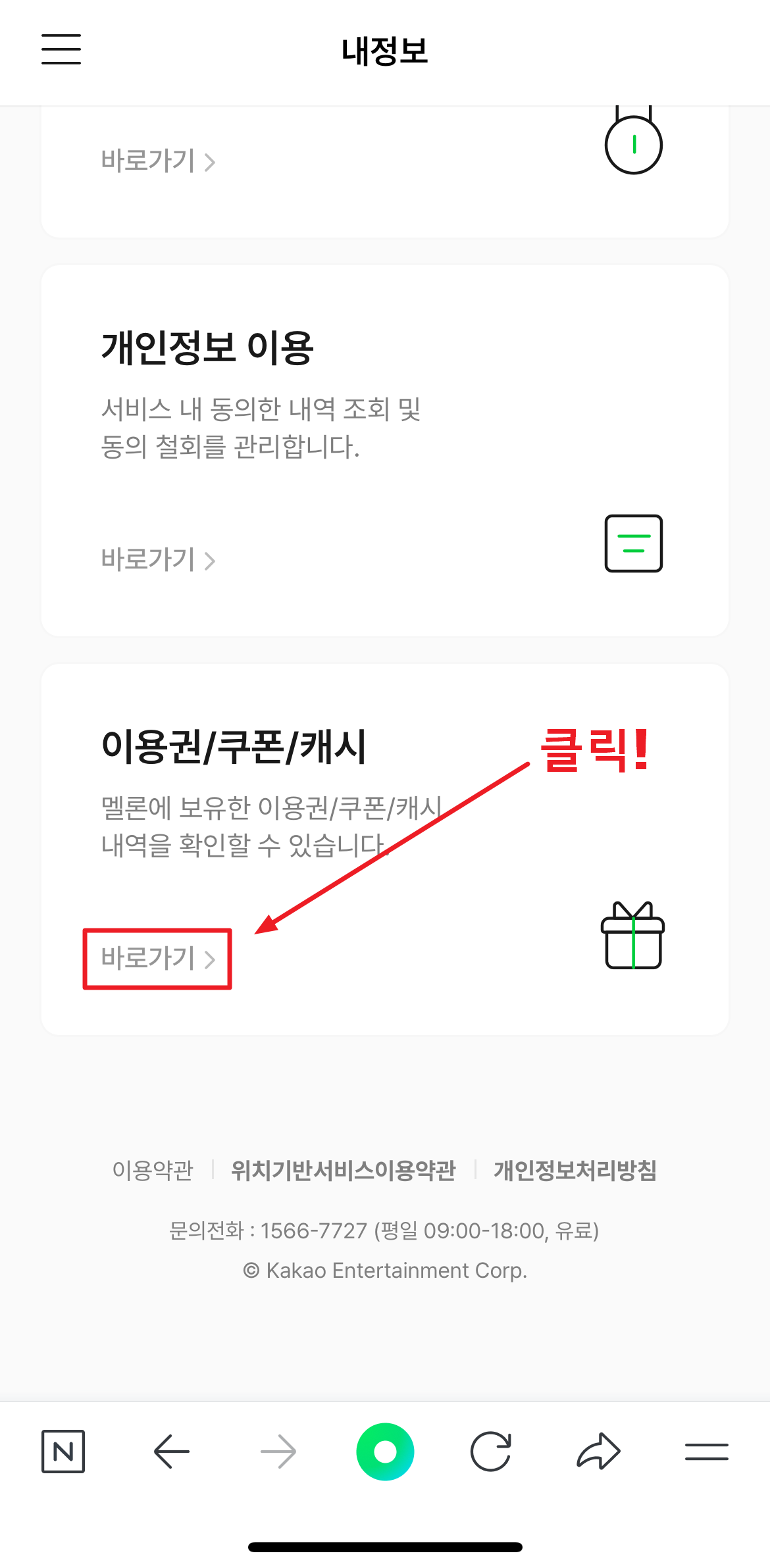 2. 내정보에서 아래로 스크롤을 내리면 "이용권/쿠폰/캐시"가 있어요. 여기로 들어가 주세요.