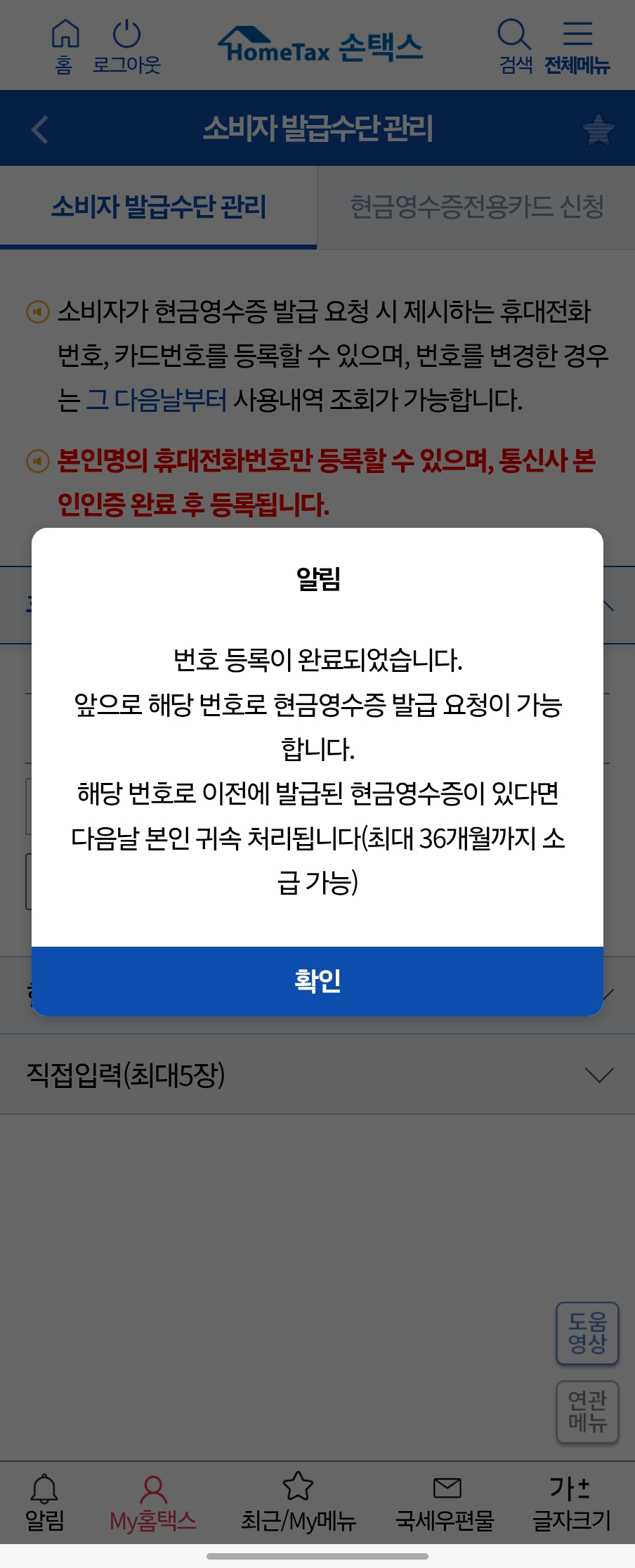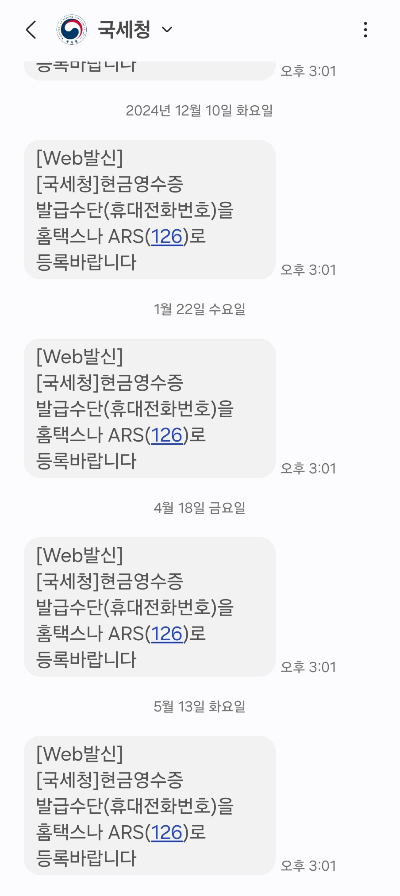 국세청 현금영수증 번호 등록 - "현금영수증 발급수단(휴대전화번호)를 홈택스나 ARS(126)로 등록 바랍니다" 문자를 받았을 경우 대처법