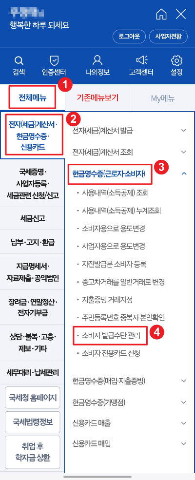 2. 전체메뉴 → "전자(세금)계산서 현금영수증 · 신용카드" → "현금영수증(근로자 소비자)" → "소비자 발급수단 관리"를 차례로 클릭합니다.