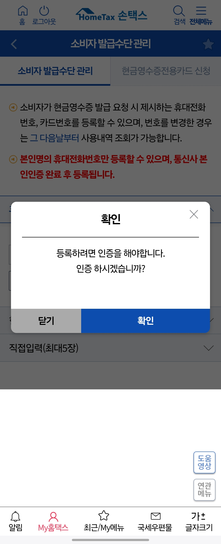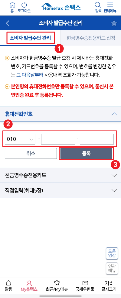 국세청 손택스로 현금영수증 핸드폰번호 등록하기