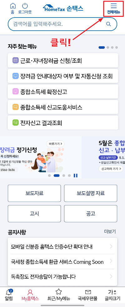 1. 국세청 손택스 모바일 앱을 여신 뒤 로그인을 하고, 우측 상단의 "전체메뉴"를 클릭합니다.