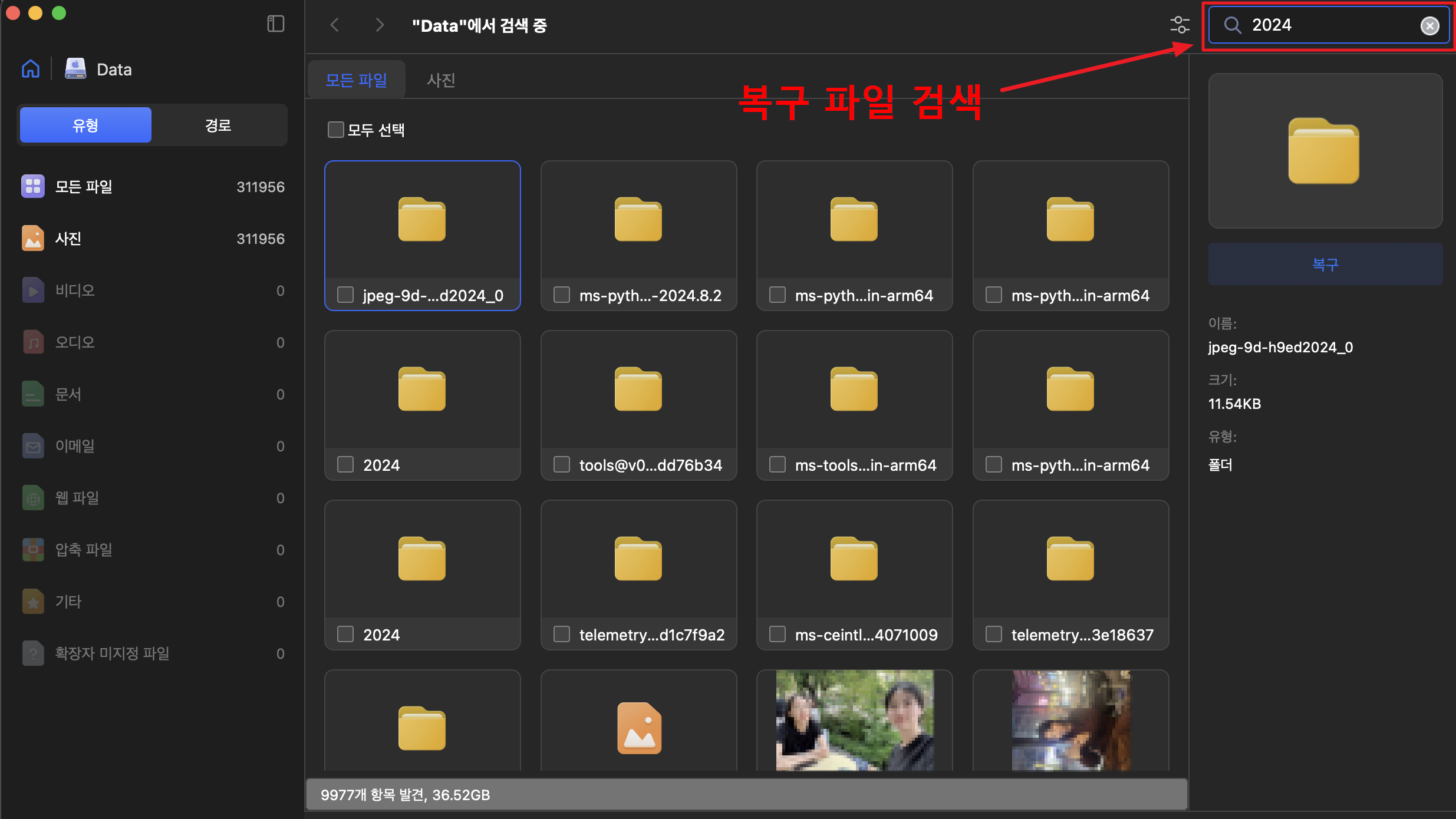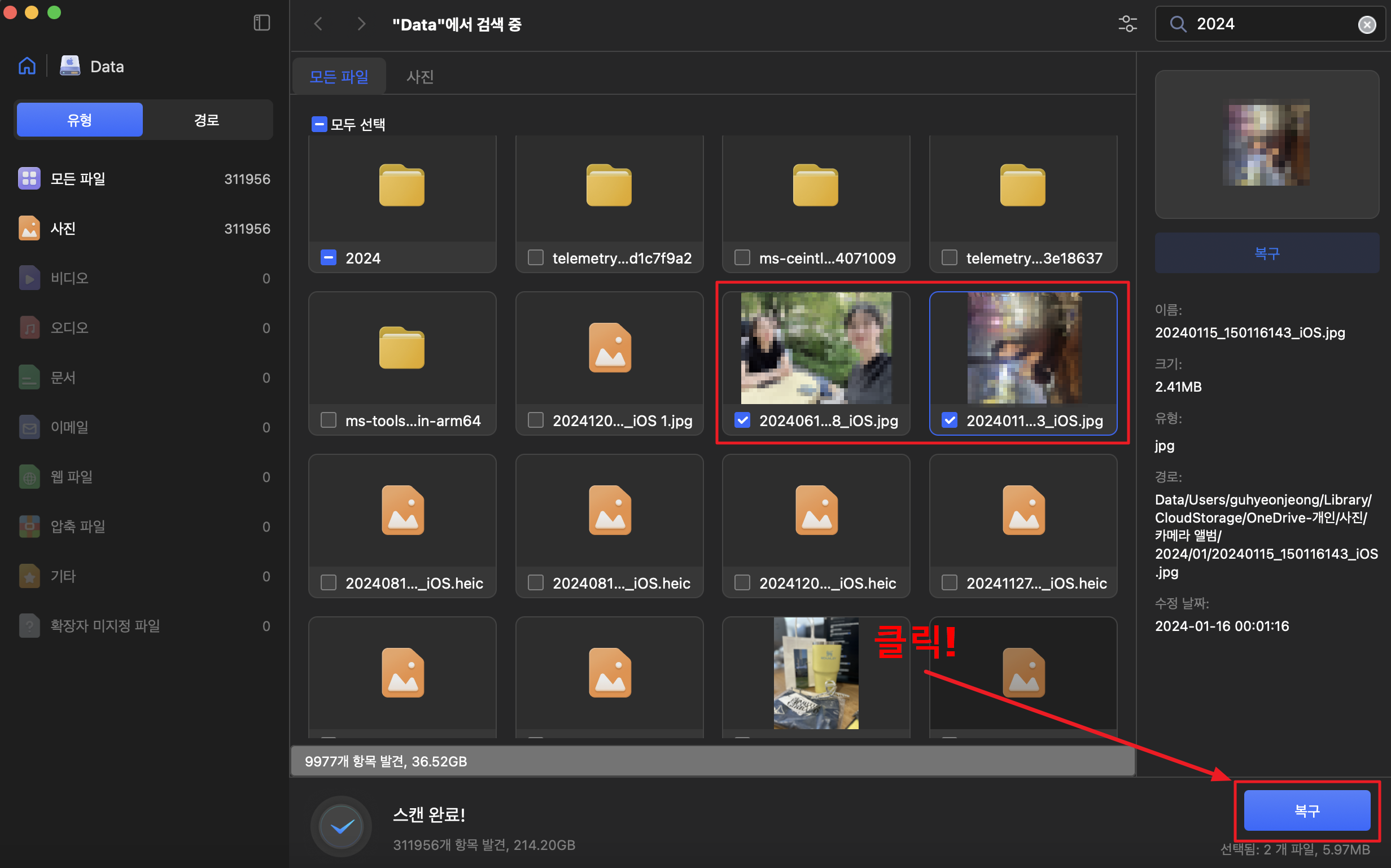 8. 복구할 파일을 찾았다면 우측 하단에 "복구" 버튼을 클릭합니다.