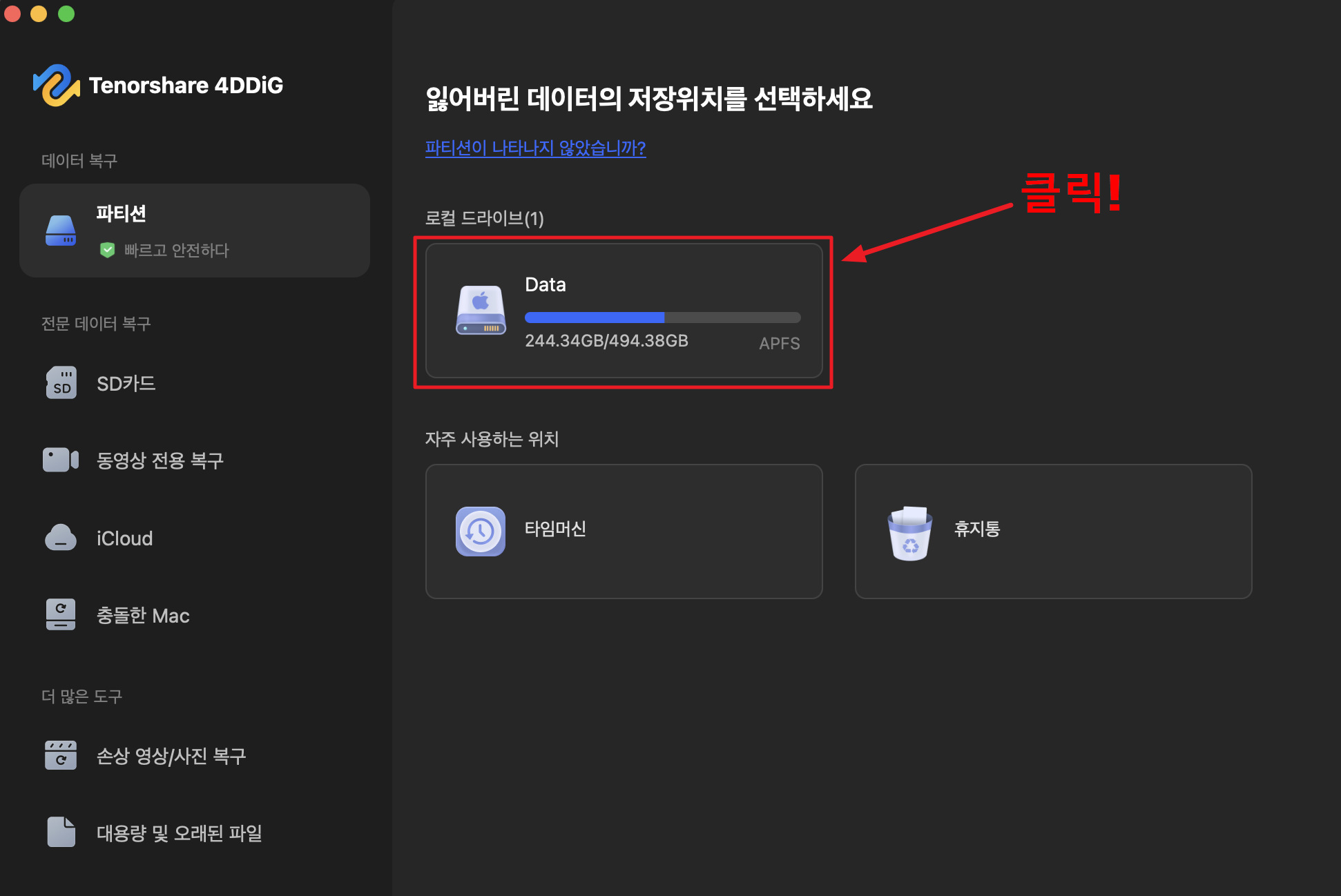 3. 테너쉐어 4DDiG 프로그램을 실행시킨 뒤 데이터를 복구 할 파티션을 선택합니다.