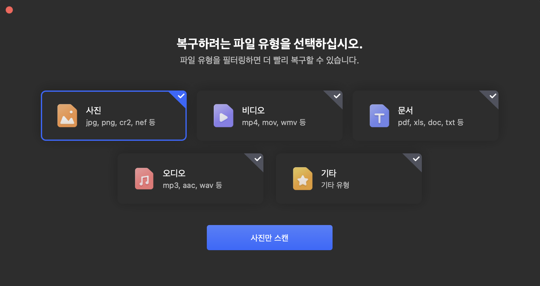 4. 복구하려는 파일 유형을 선택한 후 스캔합니다. 저는 "사진"만 스캔하도록 하겠습니다.