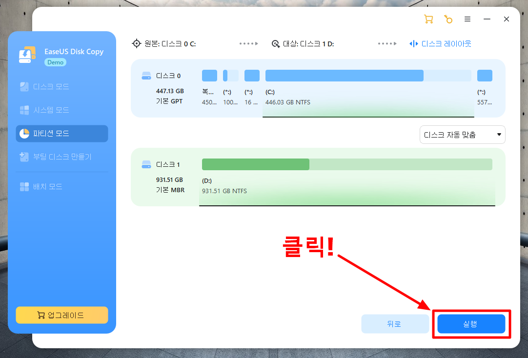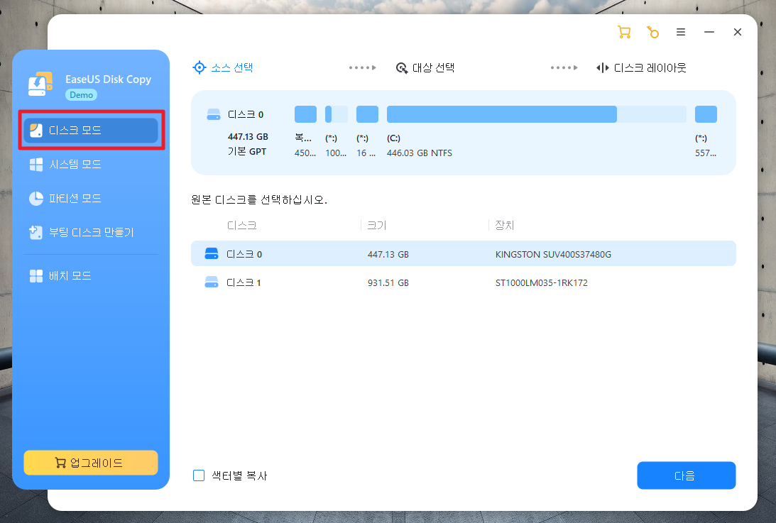 EaseUS Disk Copy 프로그램을 설치하면 위와 같은 UI/UX 화면이 실행됩니다. 디스크 모드에서 복제를 진행하면 디스크 전체가 그대로 복제됩니다.