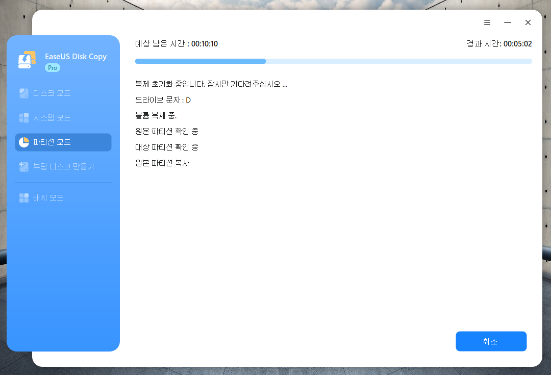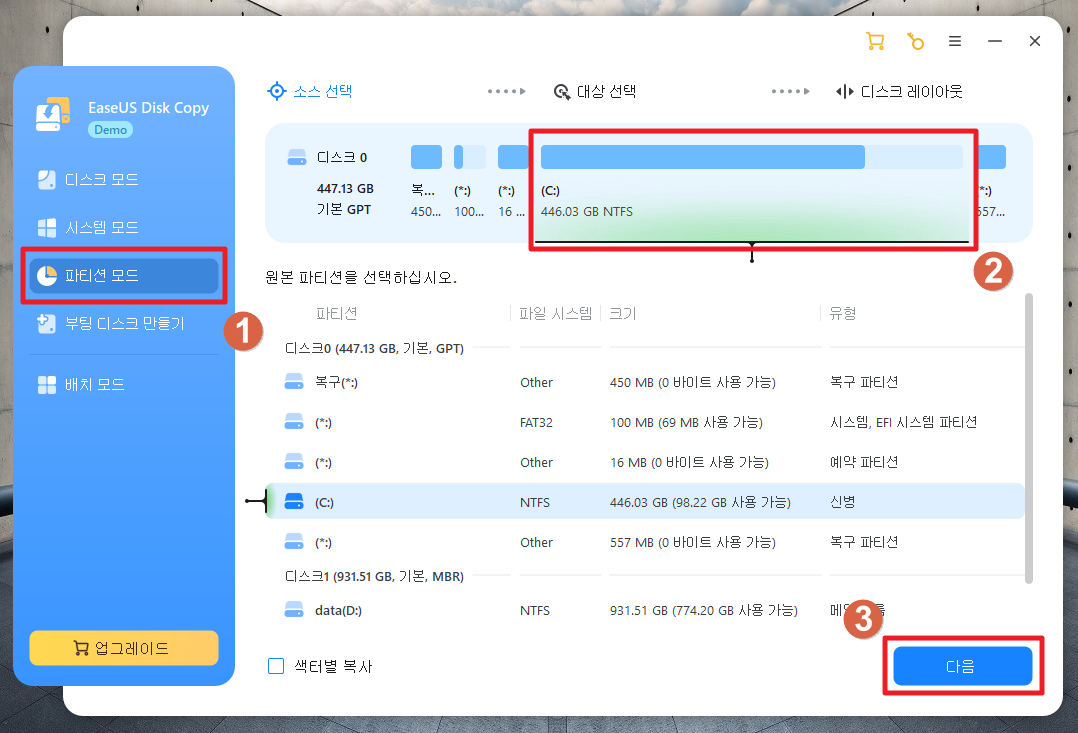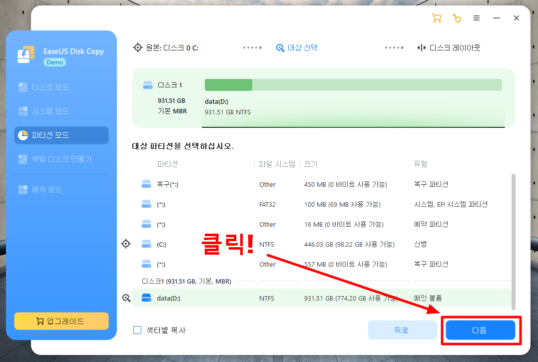 그래서 저는 파티션 모드를 선택했습니다. 파티션 모드는 저장소에서 원하는 파티션만 선택해 복제할 수 있는 기능입니다. 저는 C 드라이브에 저장된 모든 데이터를 새로 추가한 SSD인 D 드라이브로 복제했습니다.