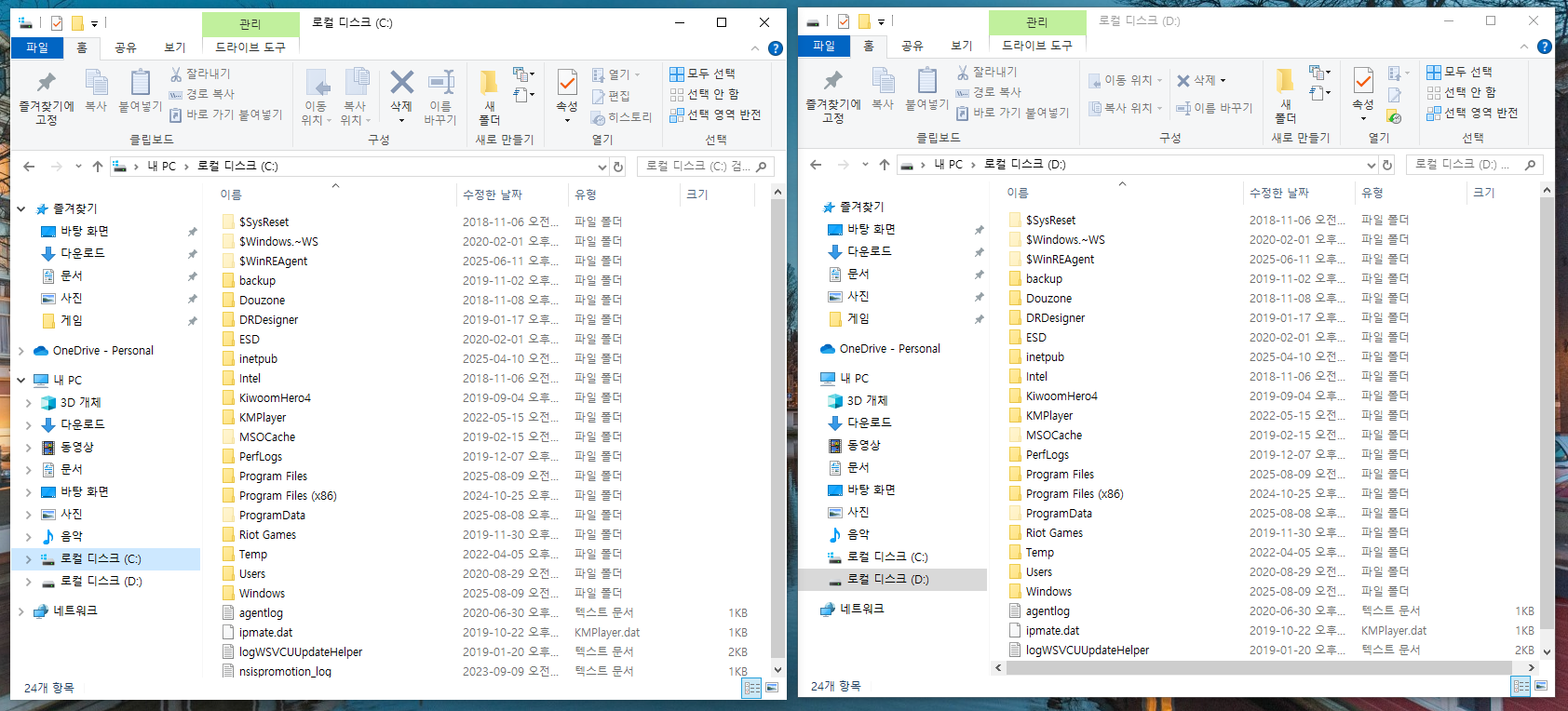 좌측 C드라이브가 원본 드라이브고, 우측의 D드라이브가 복사한 드라이브입니다. 드라이브 복제가 잘 됐네요.
